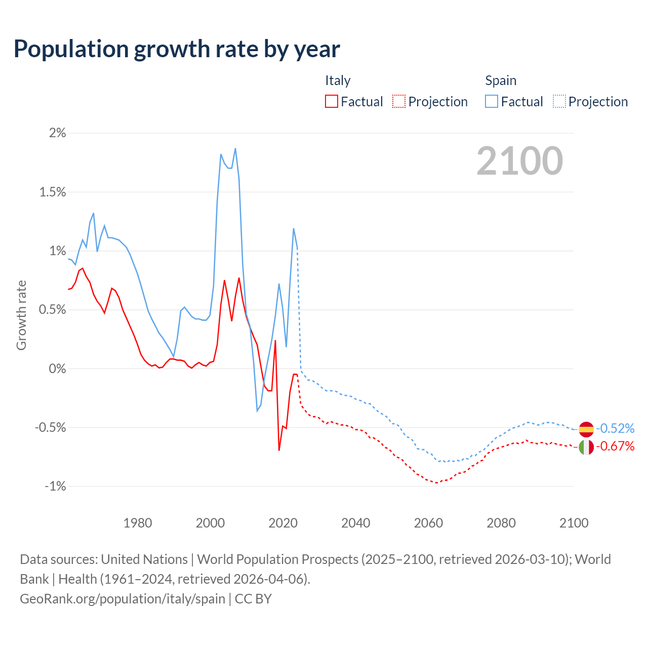 - For the last 10 years, Italy has had an average growth rate of -0.21% per year vs +0.43% in Spain.