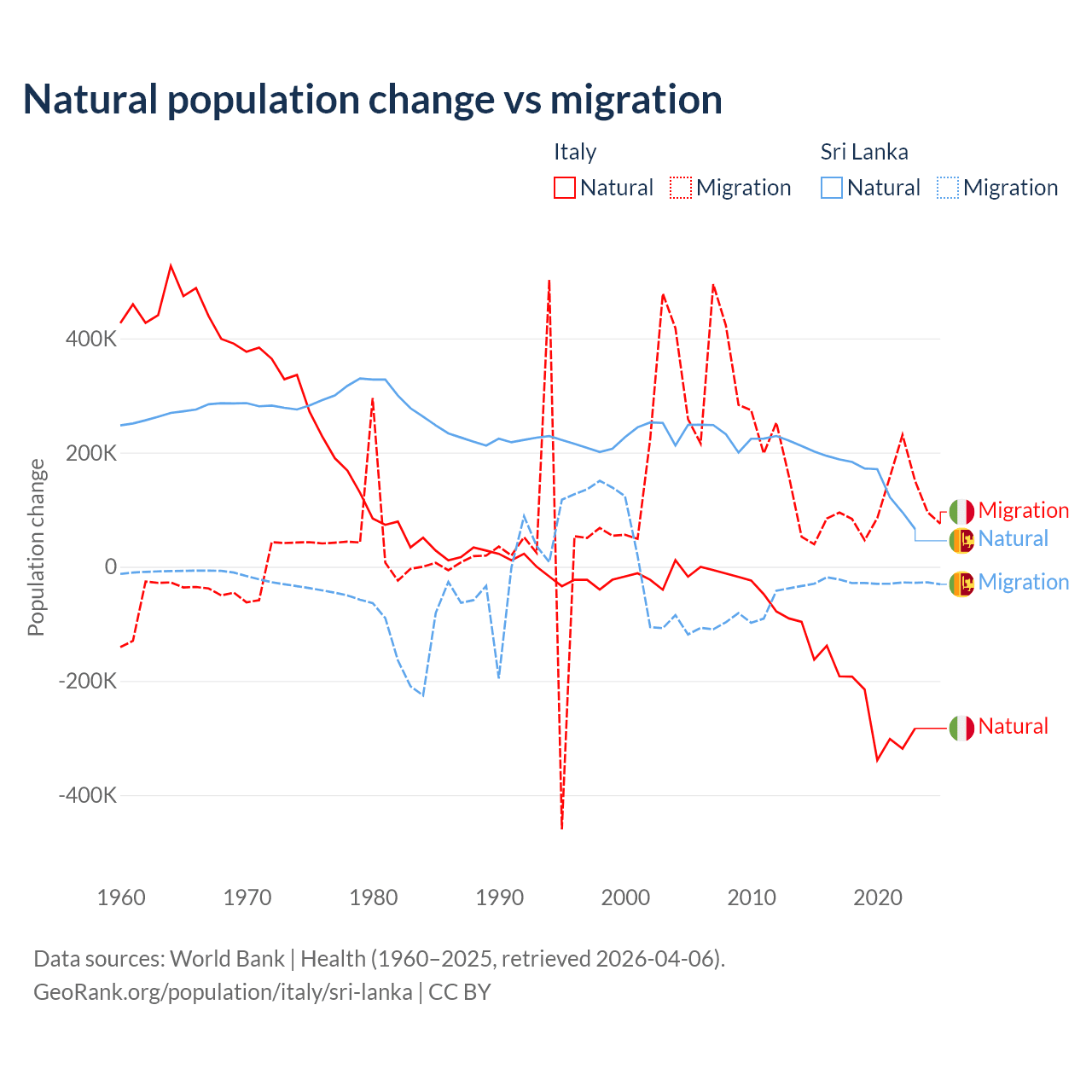 Over the last 10 years, 68.6% of the population change in Italy is from natural causes (a loss of 2,239,084 people) and 31.4% is from migration (a gain of 1,026,128 people). In Sri Lanka 85.3% is from natural causes (a gain of 1,605,749 people) and 14.7% is from migration (a loss of 276,121 people).