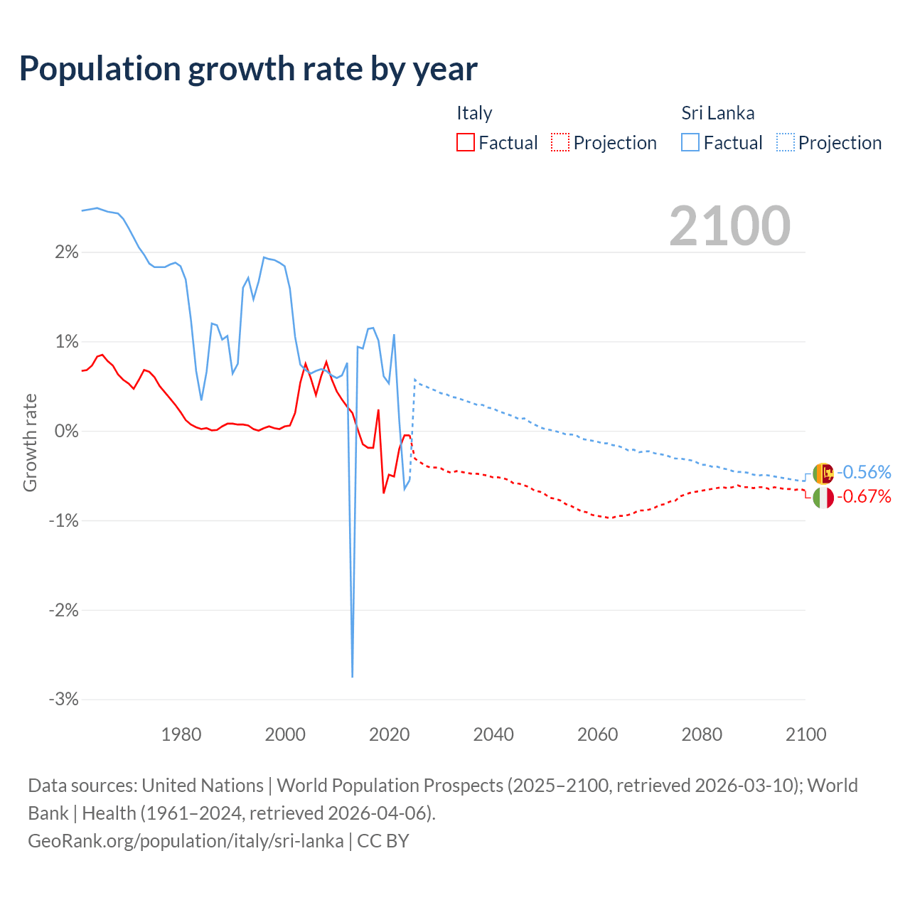 - For the last 10 years, Italy has had an average growth rate of -0.21% per year vs +0.57% in Sri Lanka.