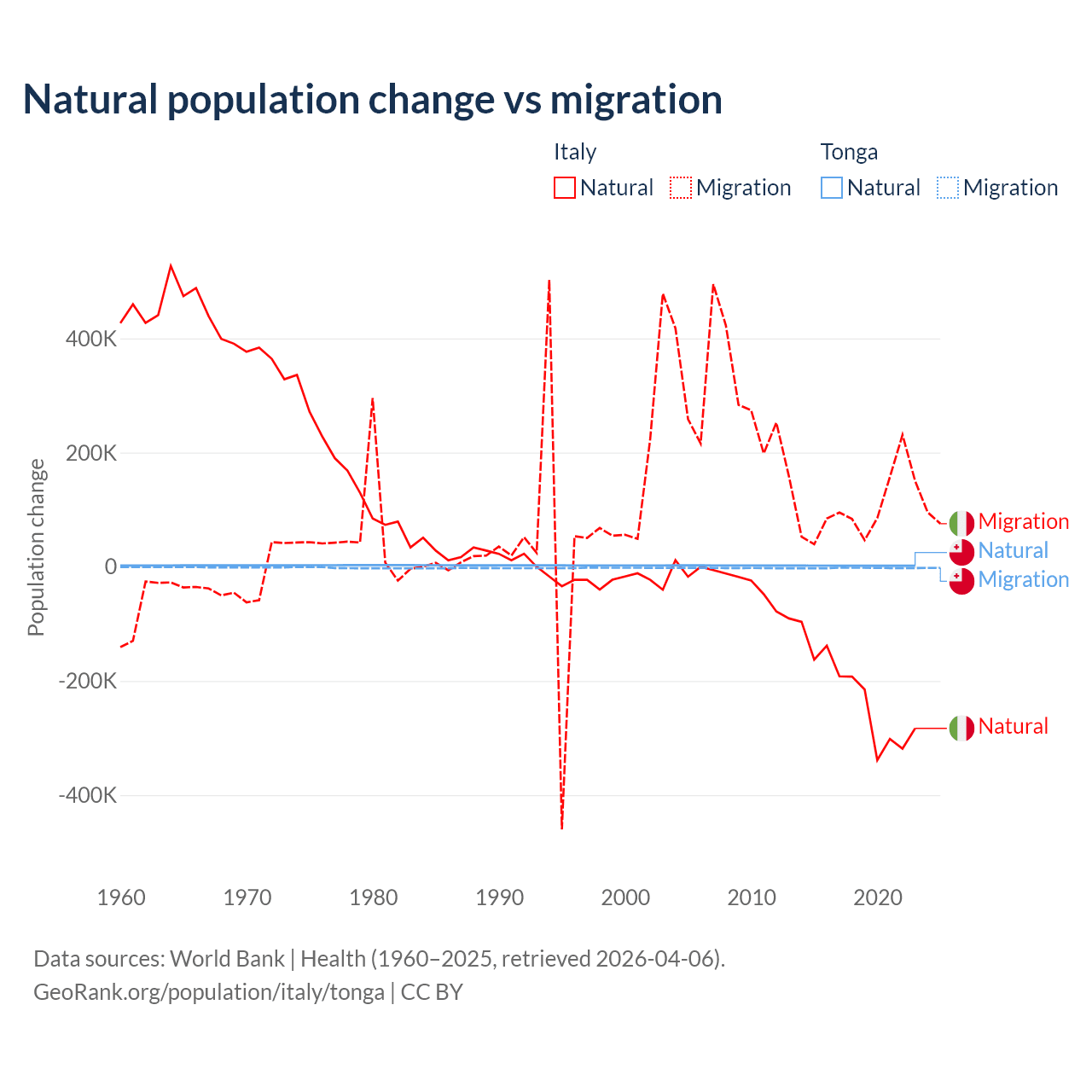 Over the last 10 years, 68.6% of the population change in Italy is from natural causes (a loss of 2,239,084 people) and 31.4% is from migration (a gain of 1,026,128 people). In Tonga 46.9% is from natural causes (a gain of 18,919 people) and 53.1% is from migration (a loss of 21,384 people).