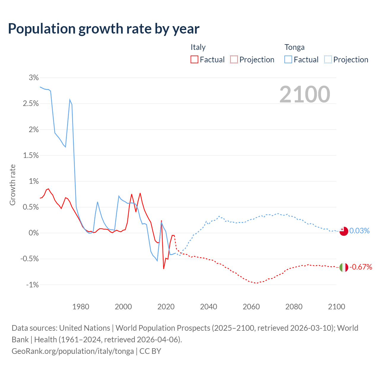 - For the last 10 years, Italy has had an average growth rate of -0.21% per year vs -0.25% in Tonga.