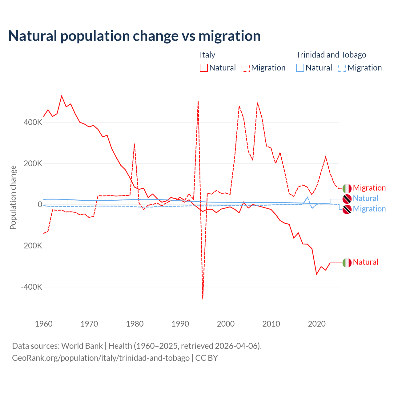 Over the last 10 years, 68.6% of the population change in Italy is from natural causes (a loss of 2,239,084 people) and 31.4% is from migration (a gain of 1,026,128 people). In Trinidad and Tobago 66% is from natural causes (a gain of 55,887 people) and 34% is from migration (a gain of 28,785 people).