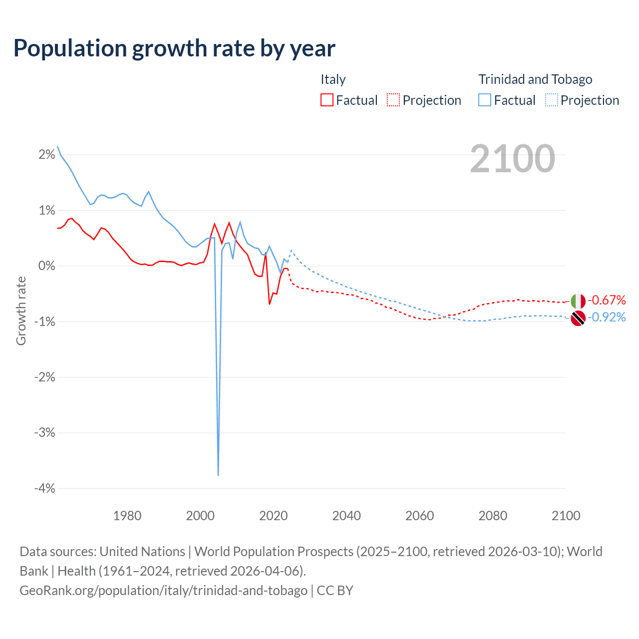 - For the last 10 years, Italy has had an average growth rate of -0.21% per year vs +0.19% in Trinidad and Tobago.