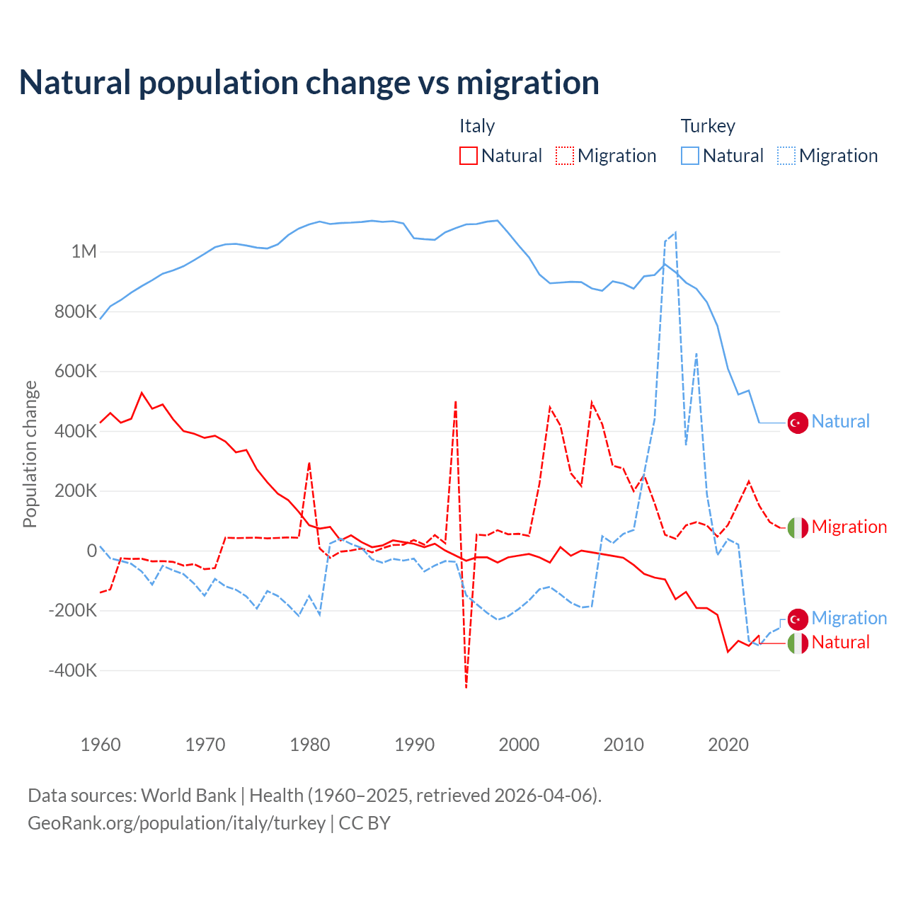 Over the last 10 years, 68.6% of the population change in Italy is from natural causes (a loss of 2,239,084 people) and 31.4% is from migration (a gain of 1,026,128 people). In Turkey 73% is from natural causes (a gain of 7,333,352 people) and 27% is from migration (a gain of 2,718,916 people).