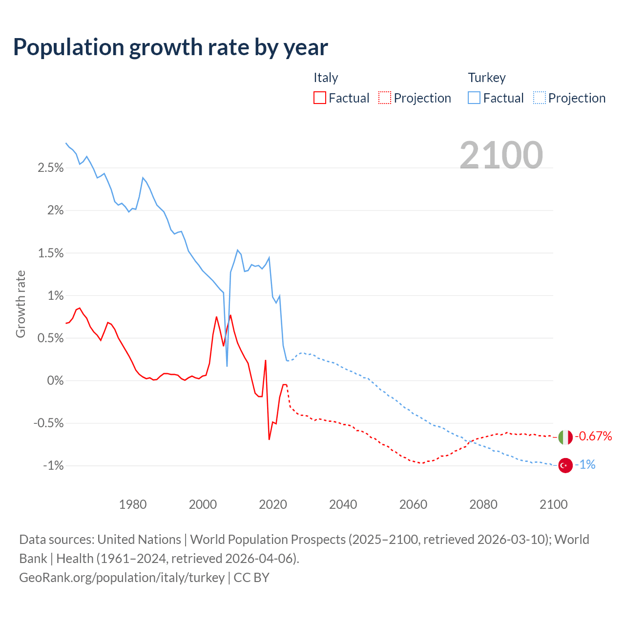 - For the last 10 years, Italy has had an average growth rate of -0.21% per year vs +1.06% in Turkey.