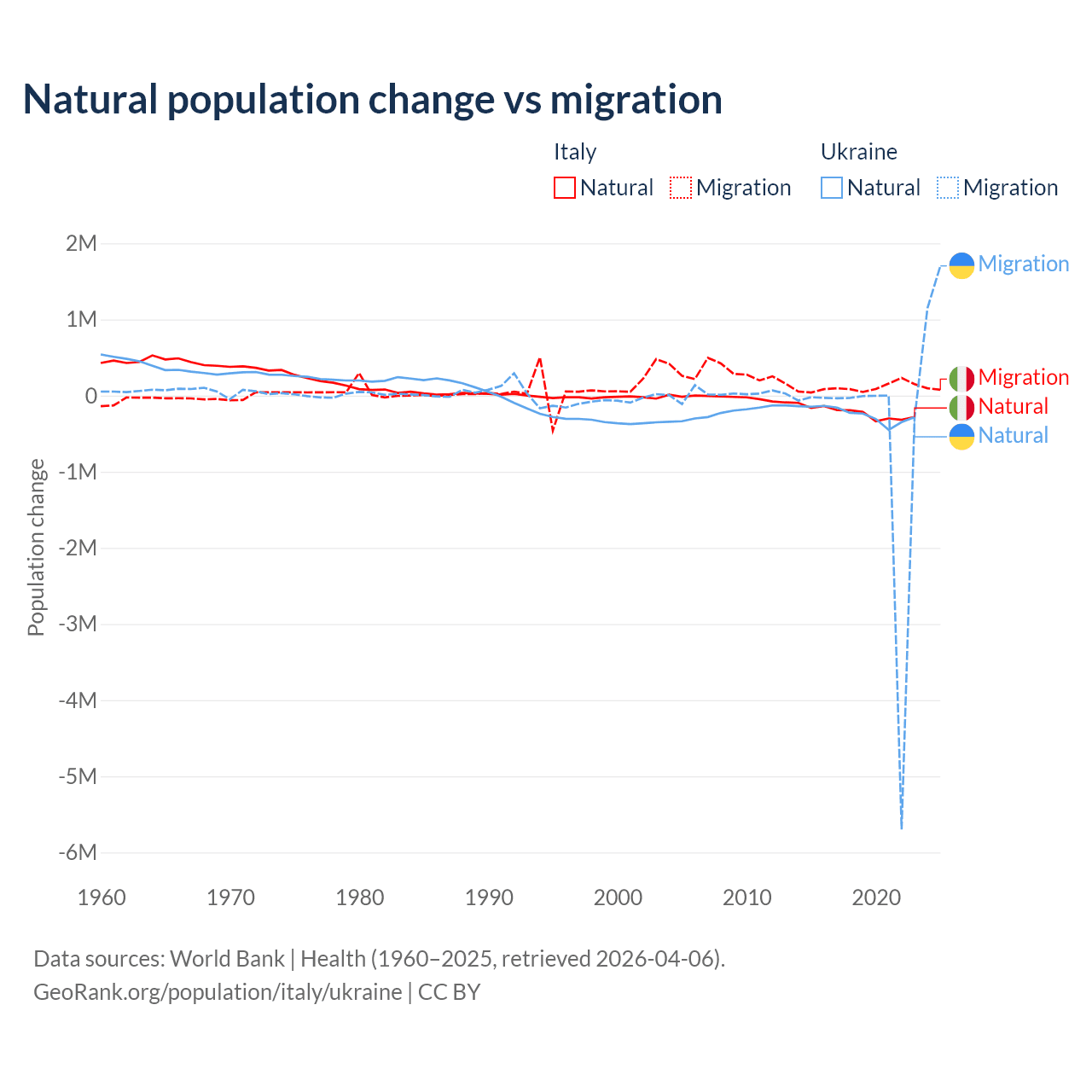 Over the last 10 years, 68.6% of the population change in Italy is from natural causes (a loss of 2,239,084 people) and 31.4% is from migration (a gain of 1,026,128 people). In Ukraine 28.2% is from natural causes (a loss of 2,435,153 people) and 71.8% is from migration (a loss of 6,198,995 people).