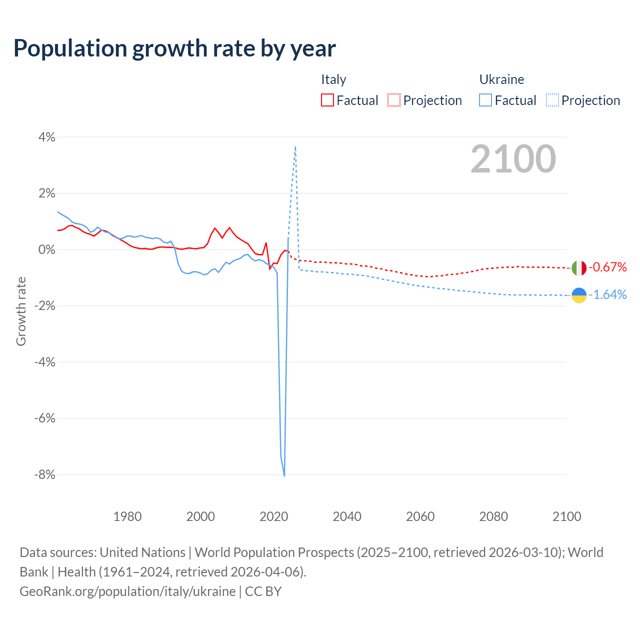 - For the last 10 years, Italy has had an average growth rate of -0.21% per year vs -1.74% in Ukraine.