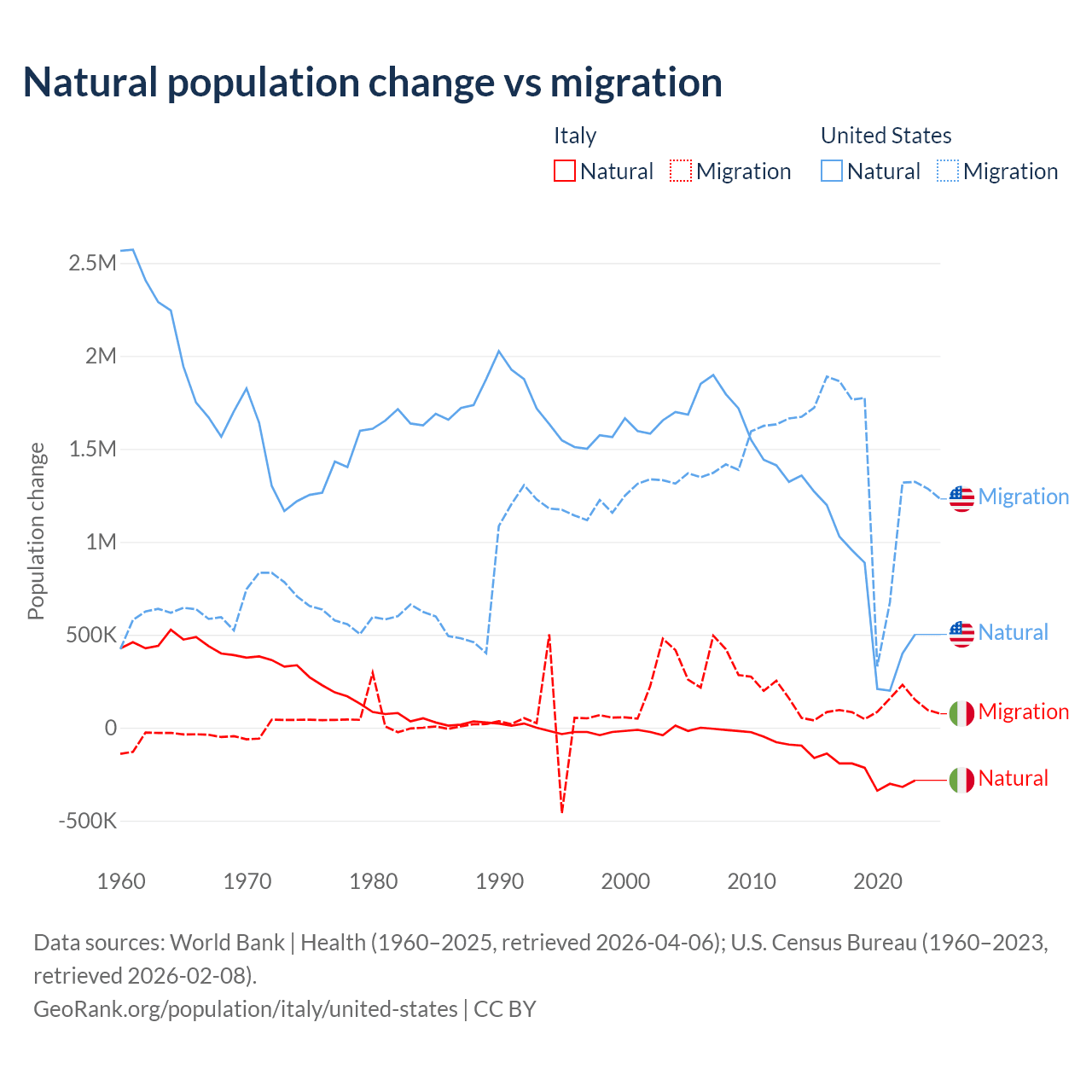 Over the last 10 years, 68.6% of the population change in Italy is from natural causes (a loss of 2,239,084 people) and 31.4% is from migration (a gain of 1,026,128 people). In the United States 35.8% is from natural causes (a gain of 8,005,866 people) and 64.2% is from migration (a gain of 14,334,286 people).