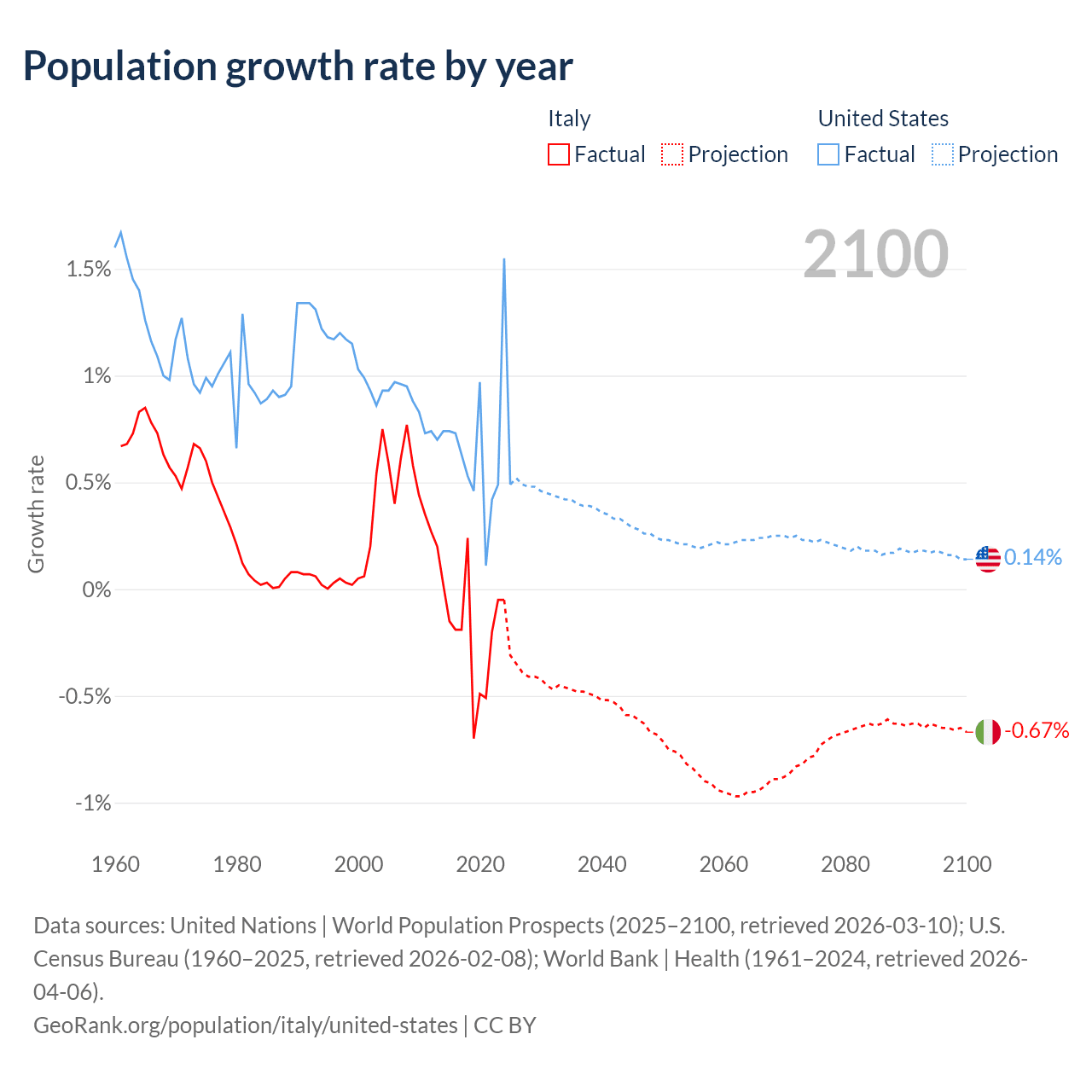 - For the last 10 years, Italy has had an average growth rate of -0.21% per year vs +0.65% in the United States.