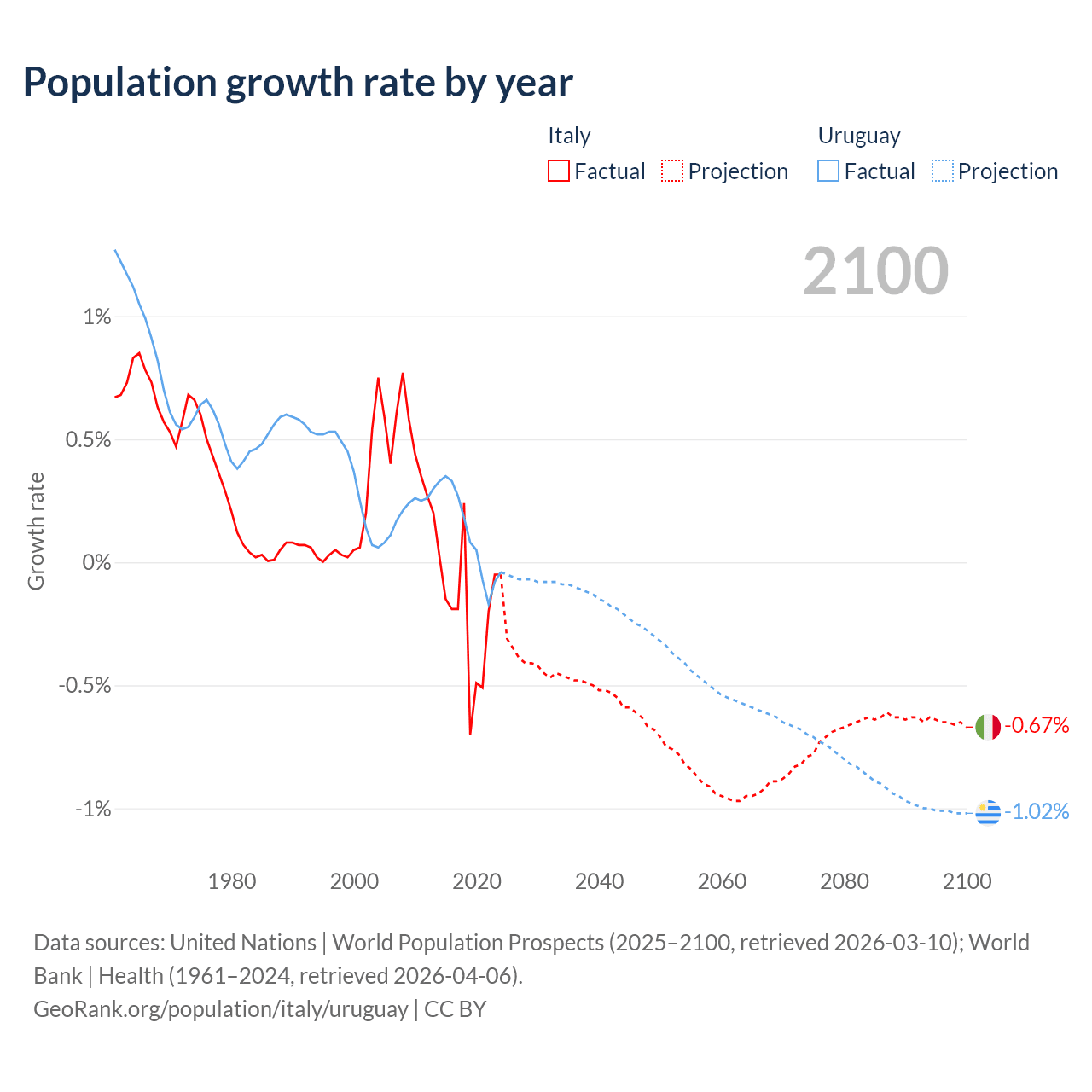 - For the last 10 years, Italy has had an average growth rate of -0.21% per year vs +0.11% in Uruguay.
