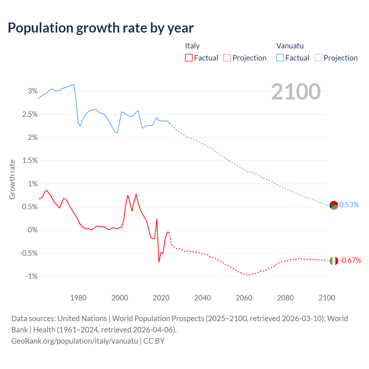 - For the last 10 years, Italy has had an average growth rate of -0.21% per year vs +2.33% in Vanuatu.