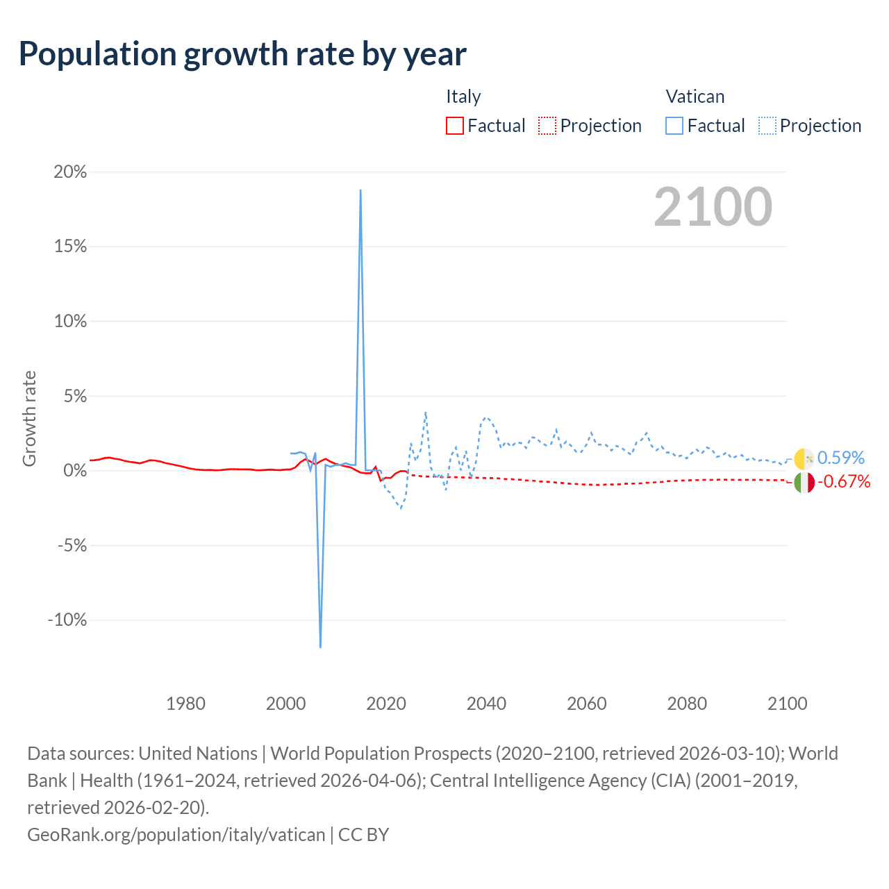 - For the last 10 years, Italy has had an average growth rate of -0.21% per year vs +1.9% in the Vatican.