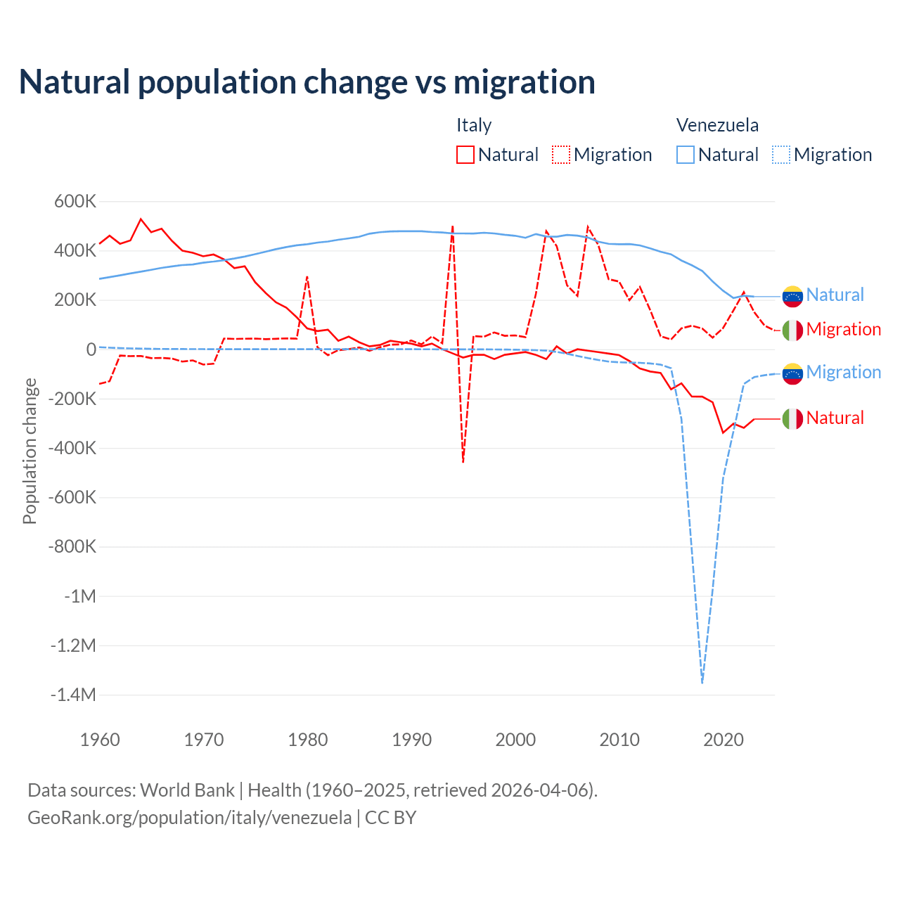 Over the last 10 years, 68.6% of the population change in Italy is from natural causes (a loss of 2,239,084 people) and 31.4% is from migration (a gain of 1,026,128 people). In Venezuela 38.6% is from natural causes (a gain of 2,946,257 people) and 61.4% is from migration (a loss of 4,683,227 people).