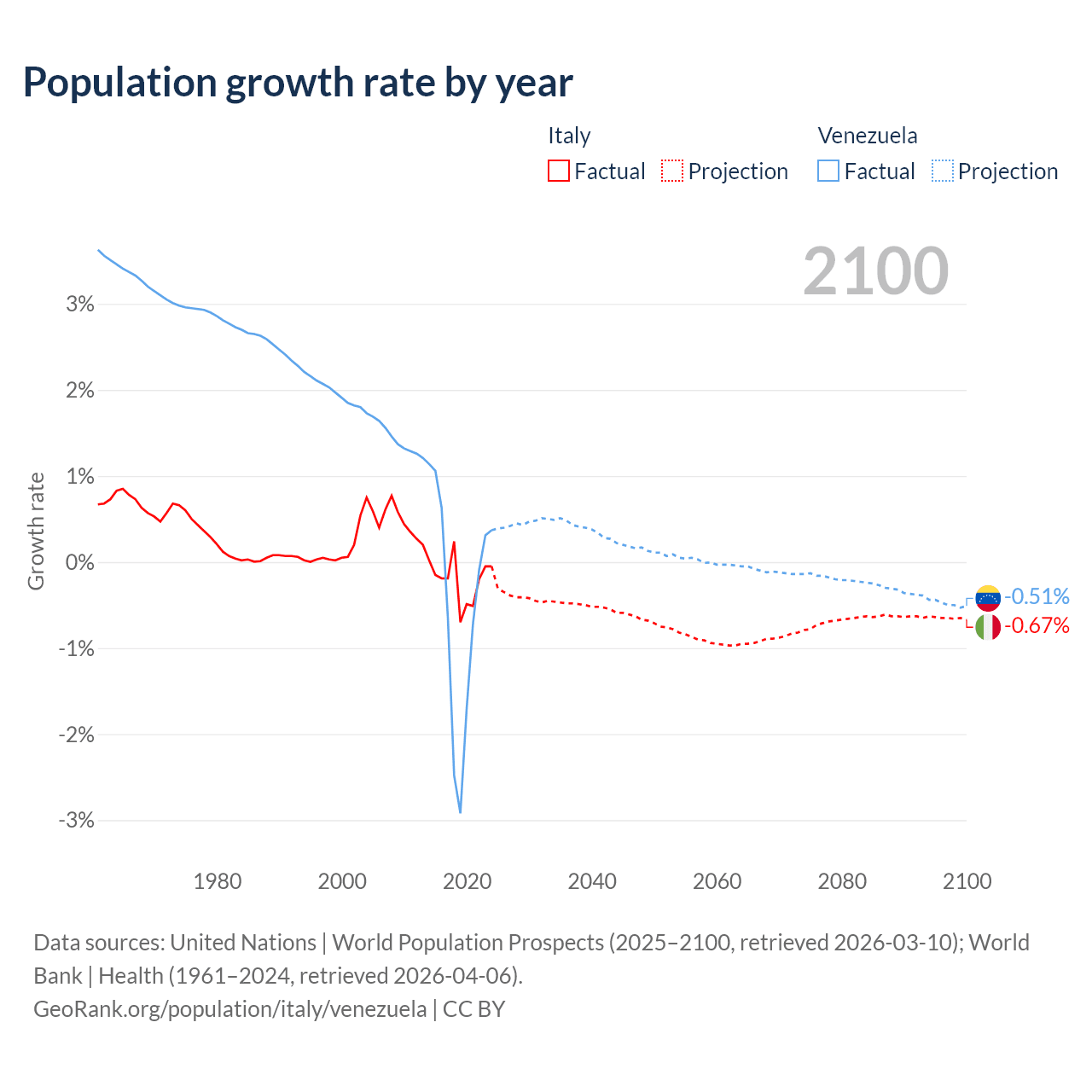 - For the last 10 years, Italy has had an average growth rate of -0.21% per year vs -0.46% in Venezuela.