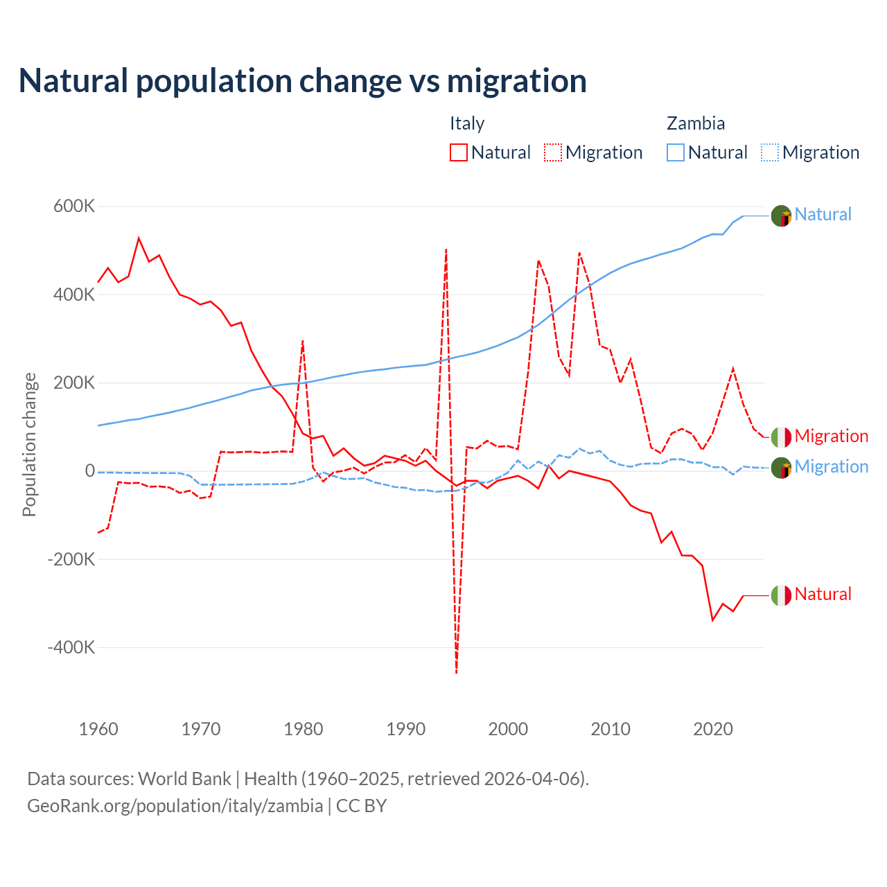 Over the last 10 years, 68.6% of the population change in Italy is from natural causes (a loss of 2,239,084 people) and 31.4% is from migration (a gain of 1,026,128 people). In Zambia 97.4% is from natural causes (a gain of 5,233,797 people) and 2.58% is from migration (a gain of 138,554 people).
