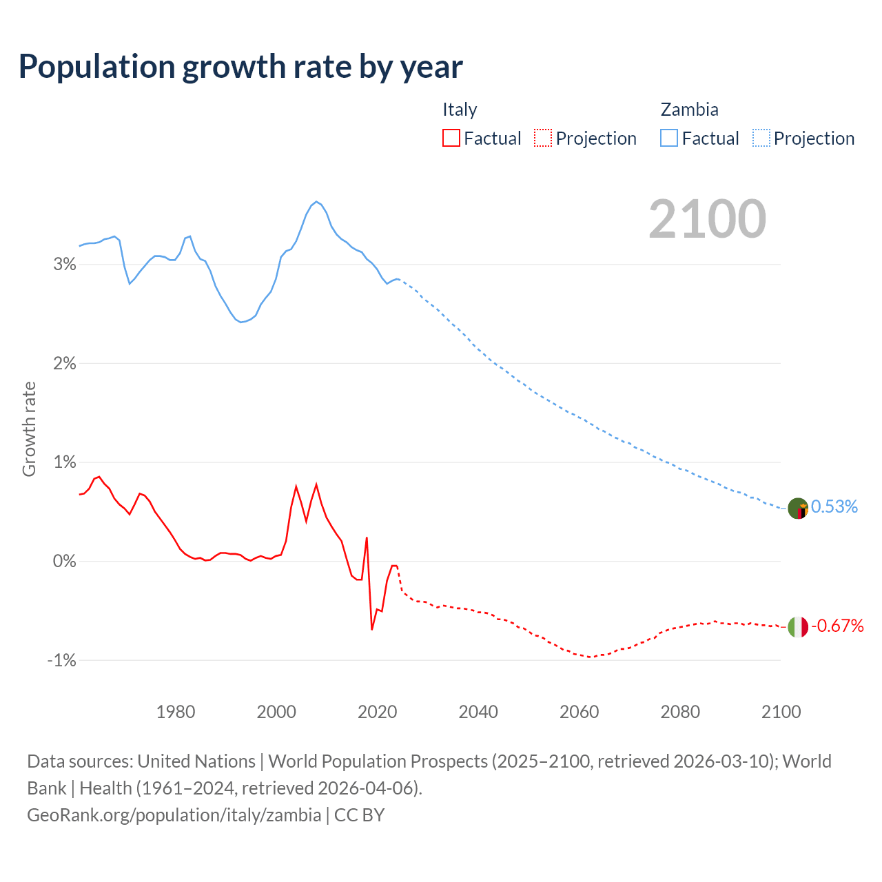 - For the last 10 years, Italy has had an average growth rate of -0.21% per year vs +3% in Zambia.