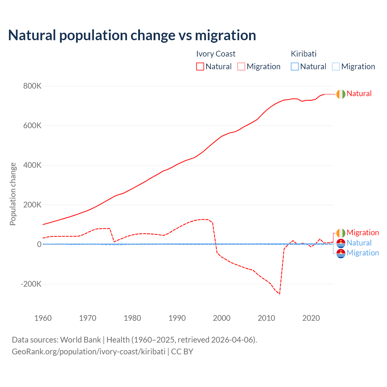 Over the last 10 years, 99.7% of the population change in Ivory Coast is from natural causes (a gain of 7,348,944 people) and 0.33% is from migration (a gain of 24,432 people). In Kiribati 80% is from natural causes (a gain of 25,262 people) and 20% is from migration (a loss of 6,330 people).