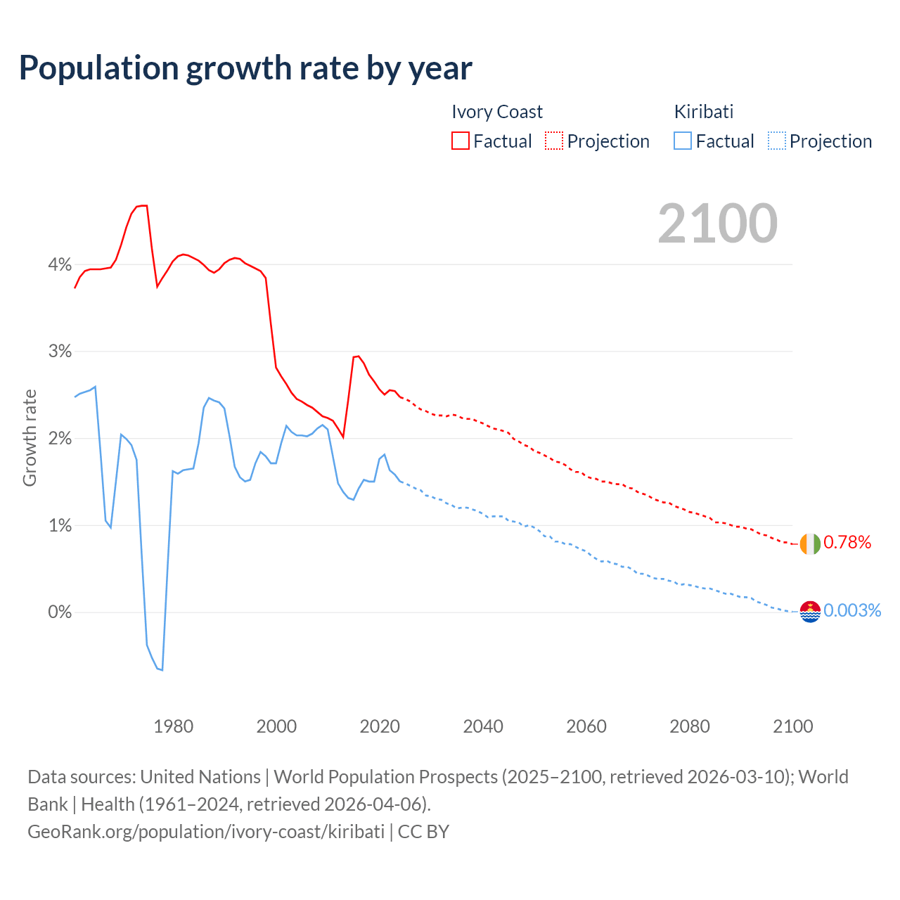 - For the last 10 years, Ivory Coast has had an average growth rate of +2.65% per year vs +1.53% in Kiribati.