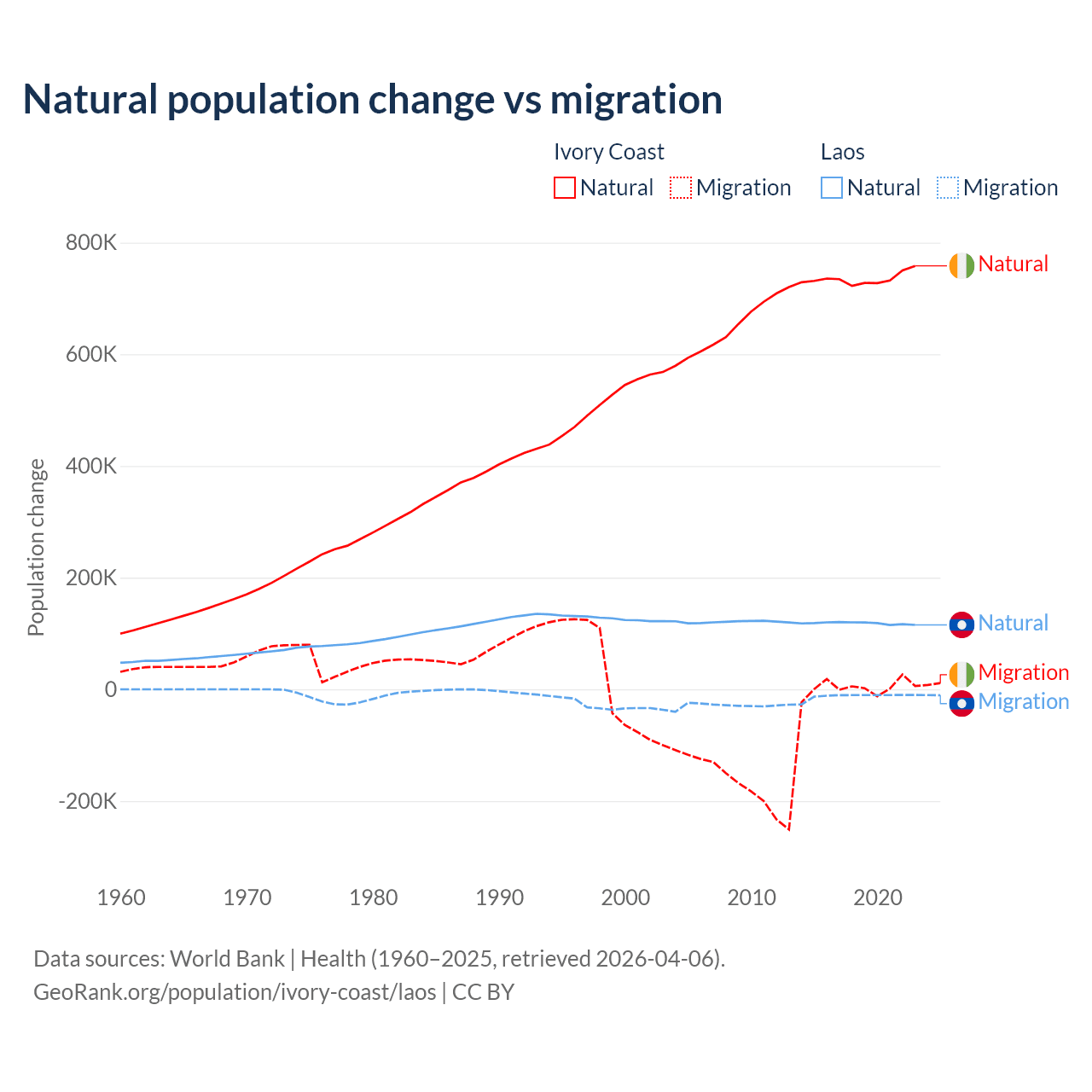 Over the last 10 years, 99.7% of the population change in Ivory Coast is from natural causes (a gain of 7,348,944 people) and 0.33% is from migration (a gain of 24,432 people). In Laos 90.6% is from natural causes (a gain of 1,183,013 people) and 9.41% is from migration (a loss of 122,899 people).