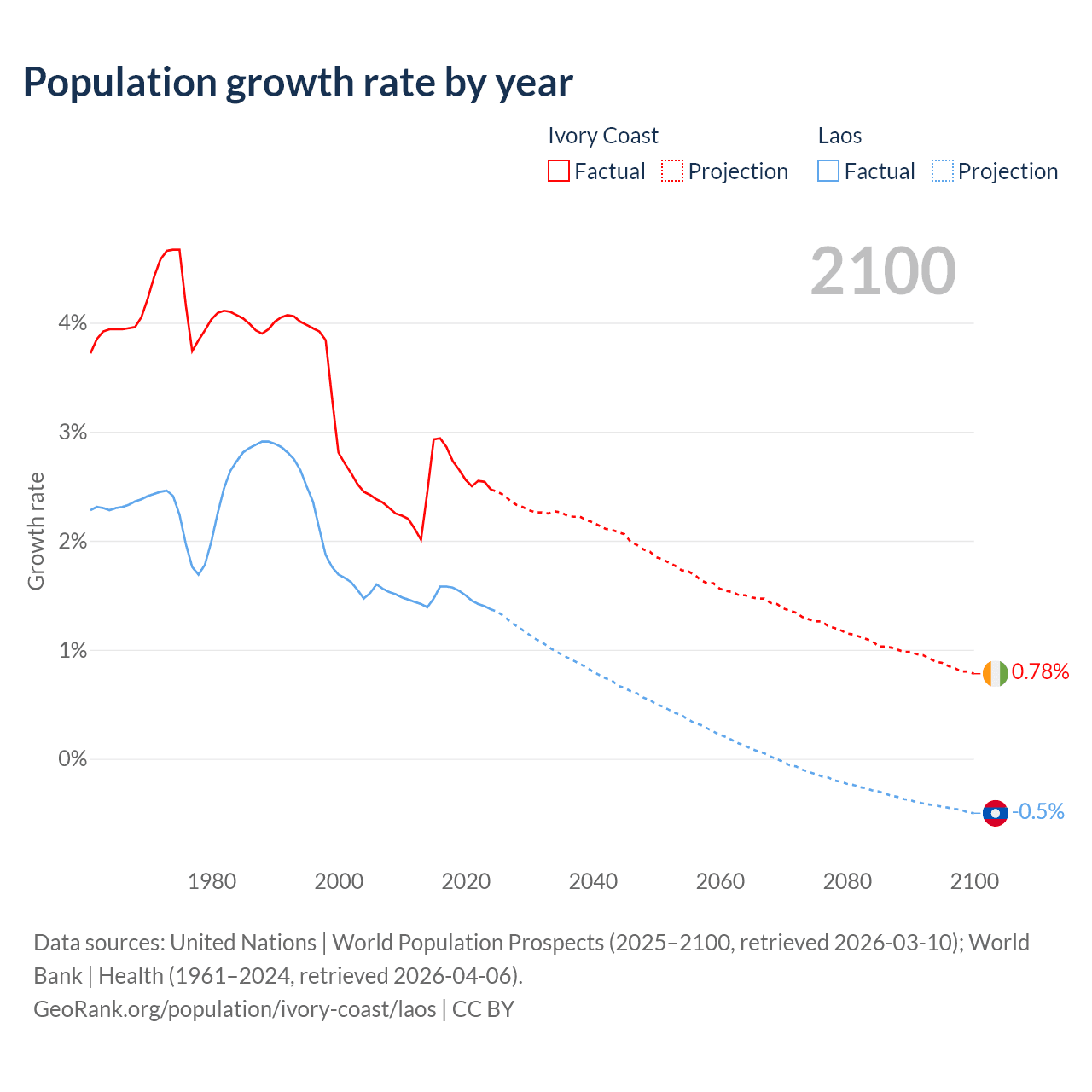 - For the last 10 years, Ivory Coast has had an average growth rate of +2.65% per year vs +1.48% in Laos.