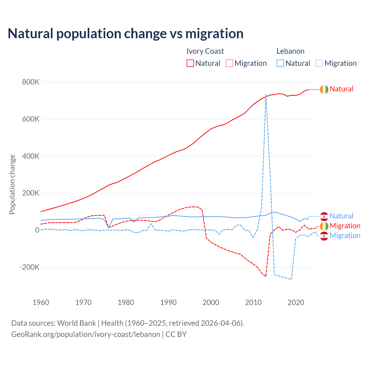 Over the last 10 years, 99.7% of the population change in Ivory Coast is from natural causes (a gain of 7,348,944 people) and 0.33% is from migration (a gain of 24,432 people). In Lebanon 40.1% is from natural causes (a gain of 739,256 people) and 59.9% is from migration (a loss of 1,103,772 people).