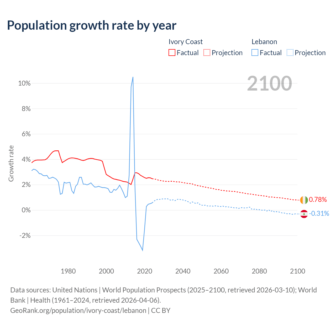 - For the last 10 years, Ivory Coast has had an average growth rate of +2.65% per year vs +0.16% in Lebanon.