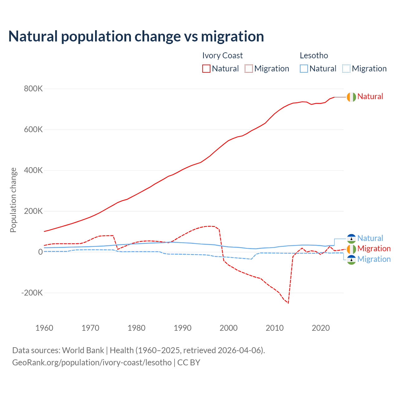 Over the last 10 years, 99.7% of the population change in Ivory Coast is from natural causes (a gain of 7,348,944 people) and 0.33% is from migration (a gain of 24,432 people). In Lesotho 84.2% is from natural causes (a gain of 315,836 people) and 15.8% is from migration (a loss of 59,457 people).