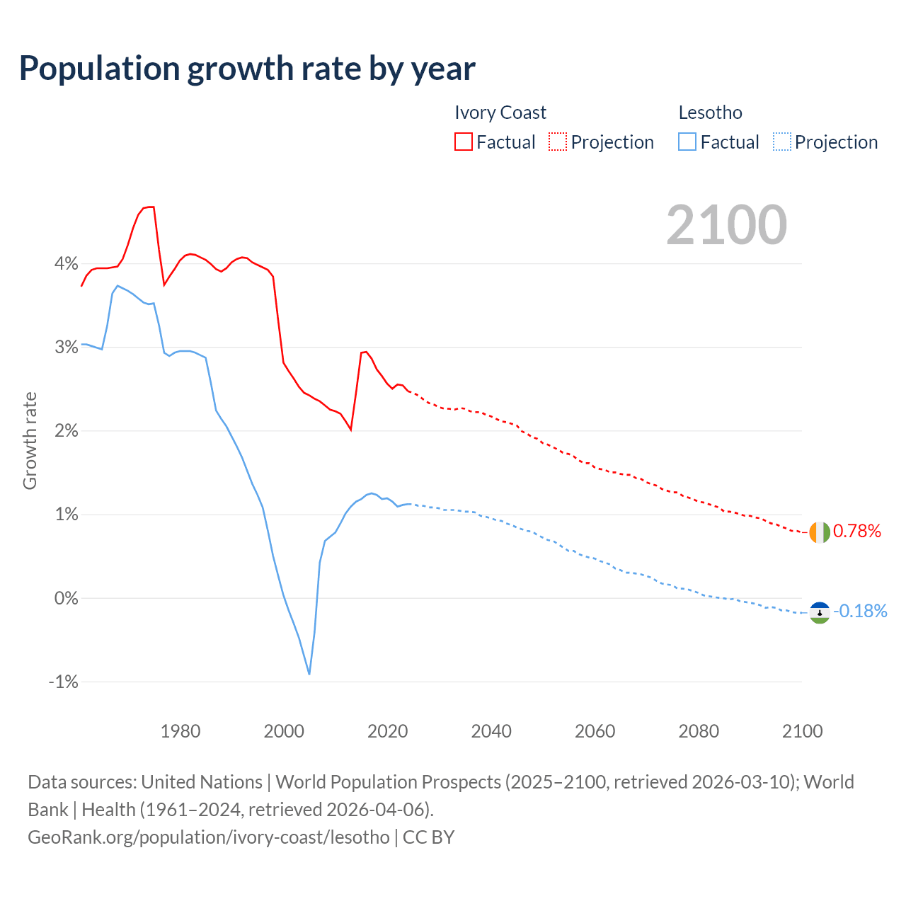 - For the last 10 years, Ivory Coast has had an average growth rate of +2.65% per year vs +1.17% in Lesotho.