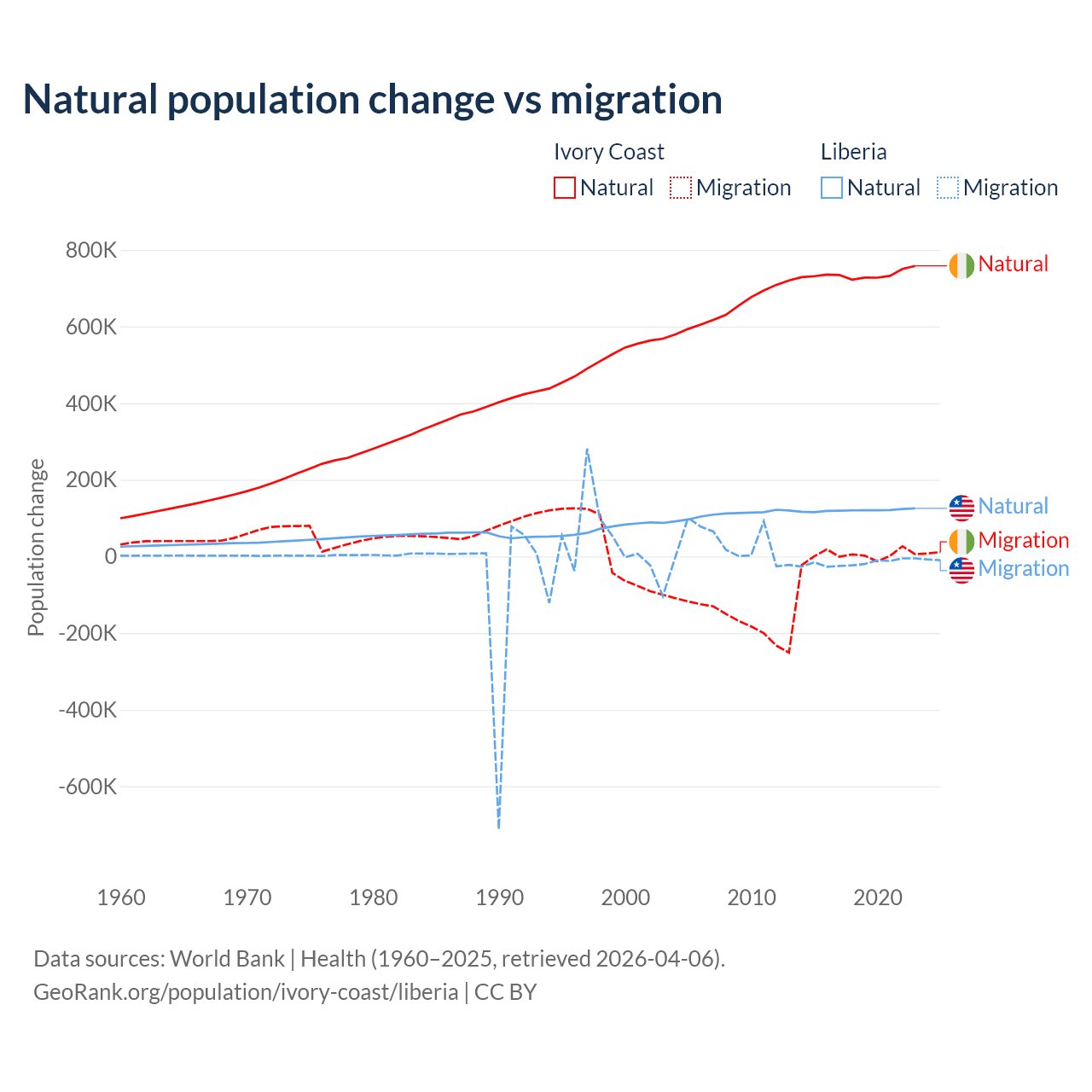 Over the last 10 years, 99.7% of the population change in Ivory Coast is from natural causes (a gain of 7,348,944 people) and 0.33% is from migration (a gain of 24,432 people). In Liberia 87.7% is from natural causes (a gain of 1,202,387 people) and 12.3% is from migration (a loss of 168,316 people).