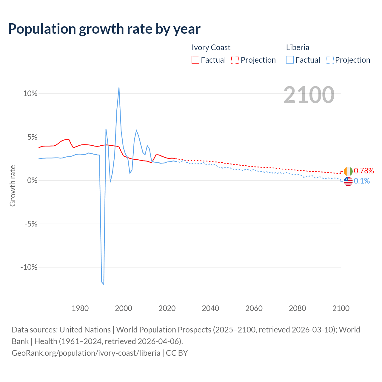 - For the last 10 years, Ivory Coast has had an average growth rate of +2.65% per year vs +2.09% in Liberia.
