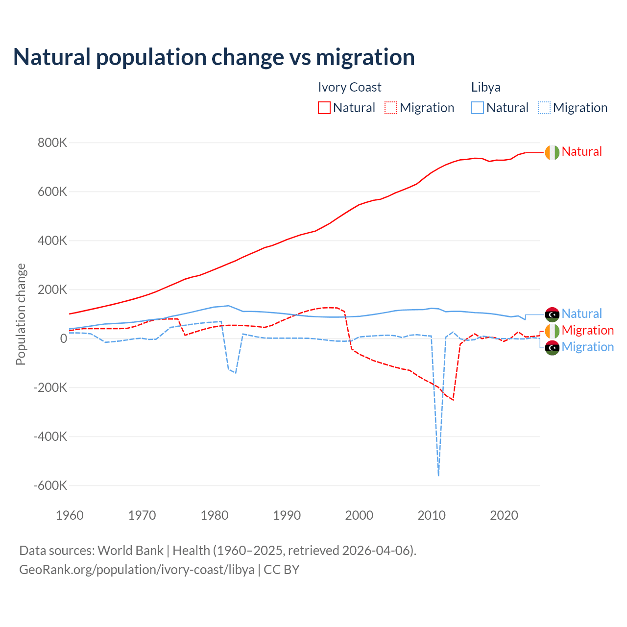 Over the last 10 years, 99.7% of the population change in Ivory Coast is from natural causes (a gain of 7,348,944 people) and 0.33% is from migration (a gain of 24,432 people). In Libya 99.4% is from natural causes (a gain of 975,799 people) and 0.63% is from migration (a loss of 6,150 people).