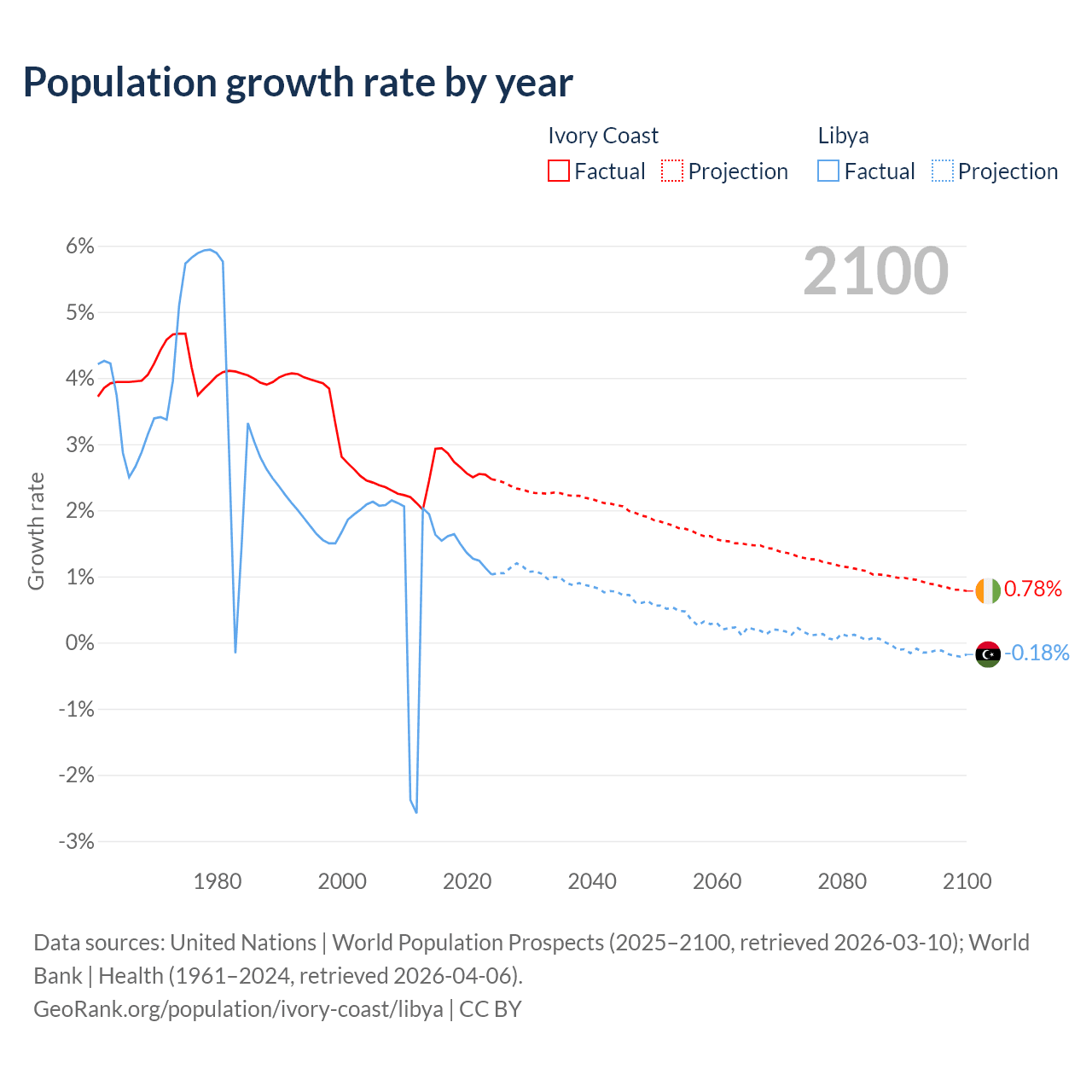 - For the last 10 years, Ivory Coast has had an average growth rate of +2.65% per year vs +1.44% in Libya.