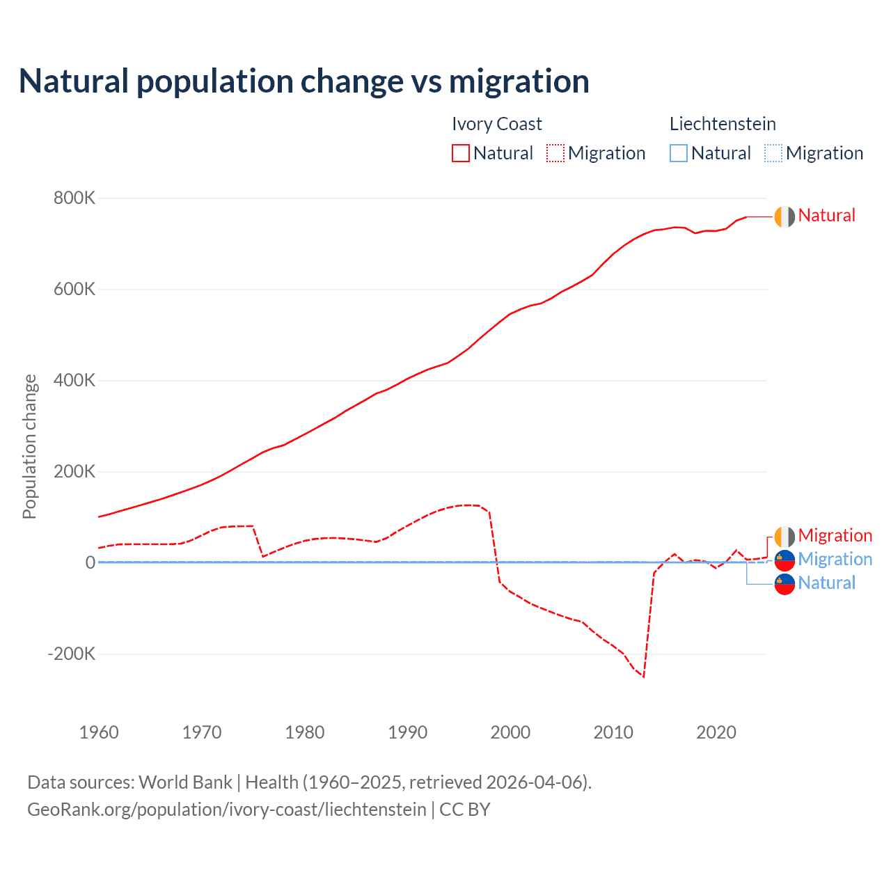 Over the last 10 years, 99.7% of the population change in Ivory Coast is from natural causes (a gain of 7,348,944 people) and 0.33% is from migration (a gain of 24,432 people). In Liechtenstein 32.4% is from natural causes (a gain of 883 people) and 67.6% is from migration (a gain of 1,843 people).