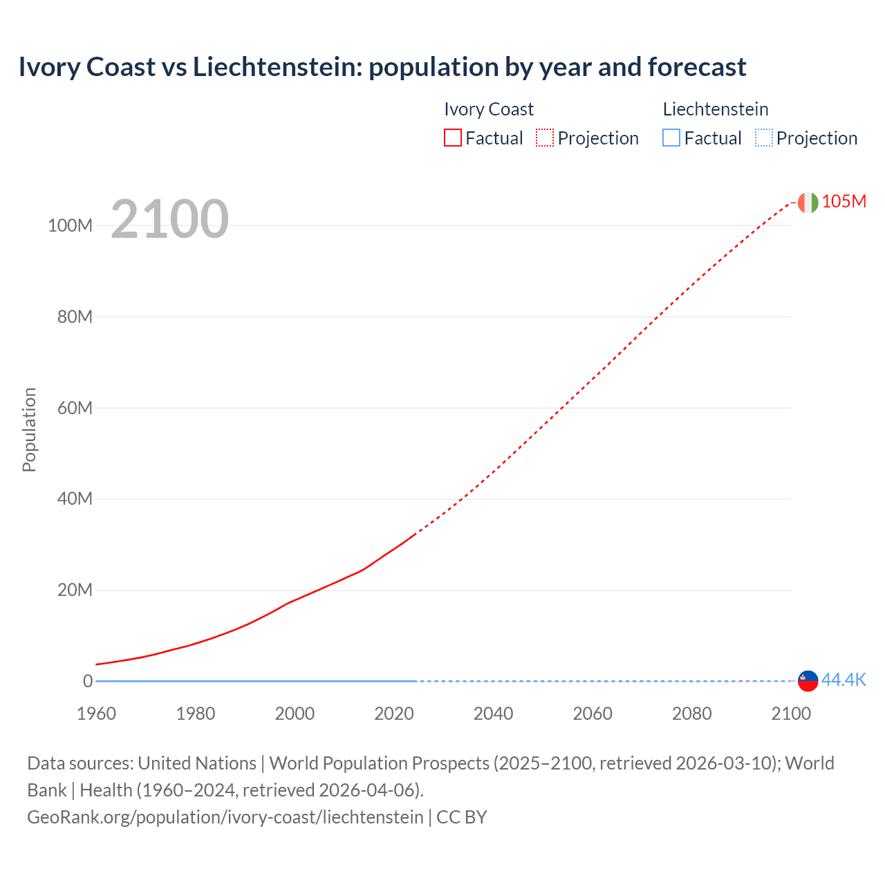 Ivory Coast vs Liechtenstein: population by year and forecast
