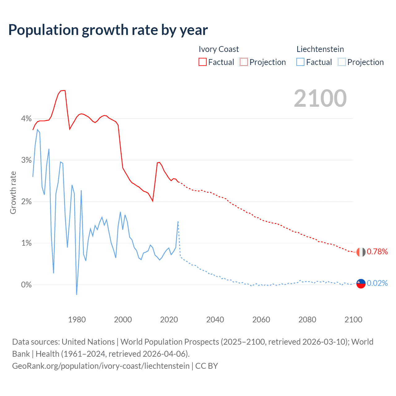 - For the last 10 years, Ivory Coast has had an average growth rate of +2.65% per year vs +0.82% in Liechtenstein.