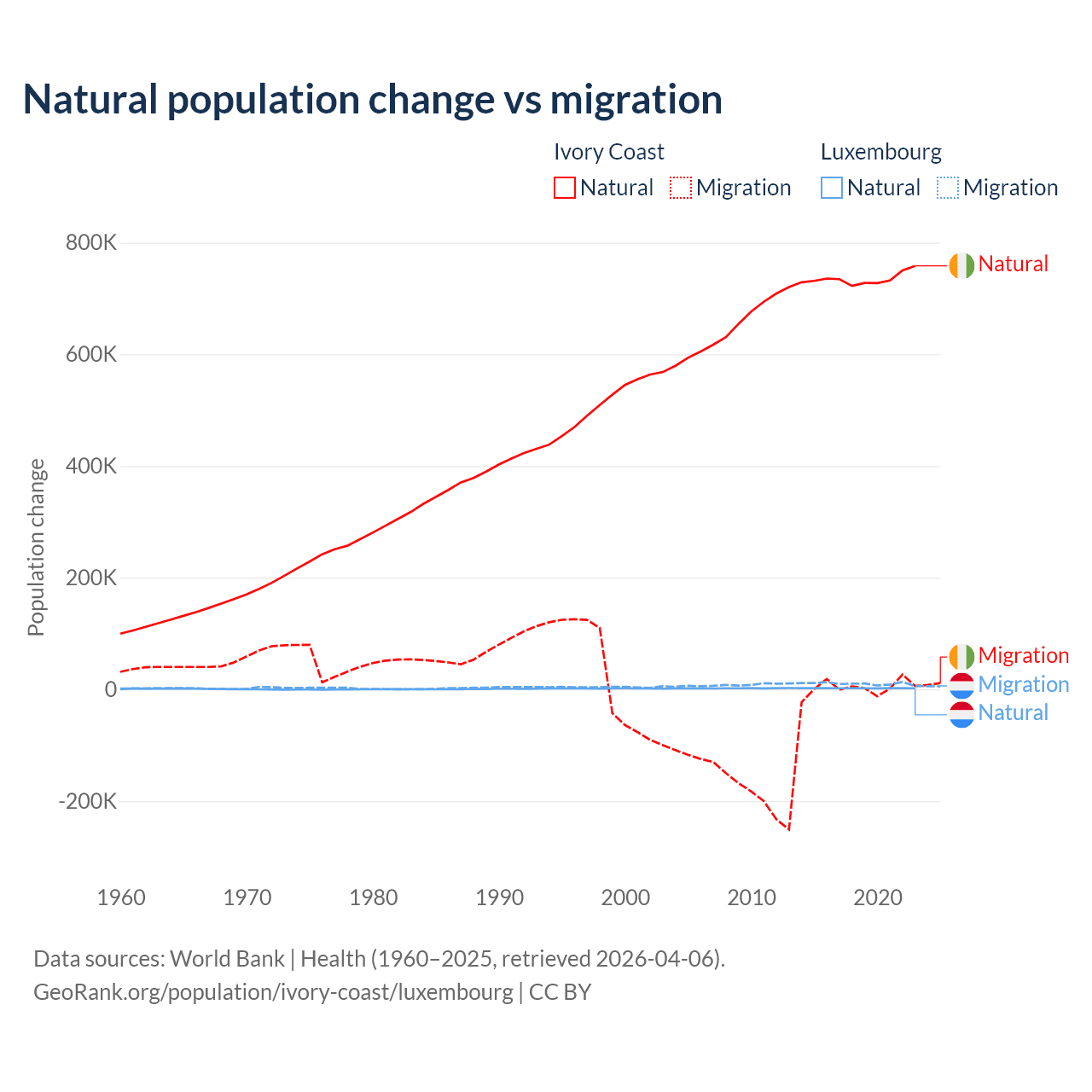 Over the last 10 years, 99.7% of the population change in Ivory Coast is from natural causes (a gain of 7,348,944 people) and 0.33% is from migration (a gain of 24,432 people). In Luxembourg 16.8% is from natural causes (a gain of 20,287 people) and 83.2% is from migration (a gain of 100,435 people).