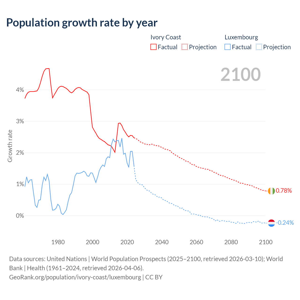 - For the last 10 years, Ivory Coast has had an average growth rate of +2.65% per year vs +2.02% in Luxembourg.