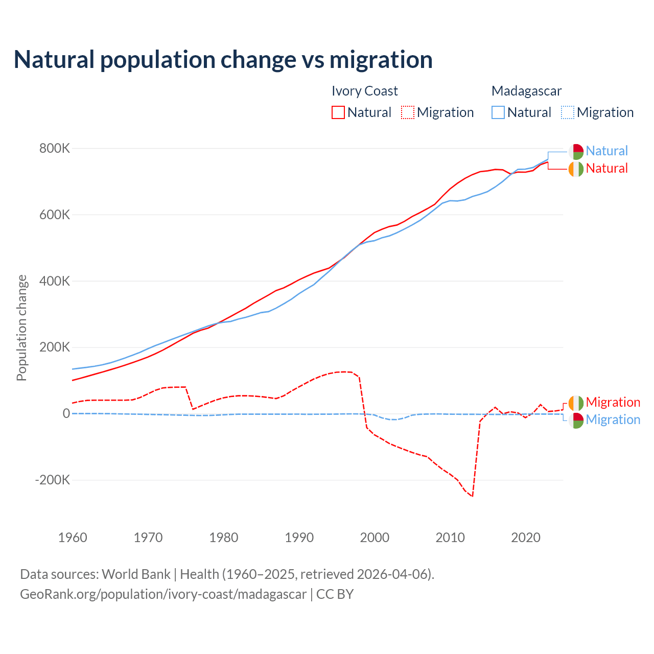 Over the last 10 years, 99.7% of the population change in Ivory Coast is from natural causes (a gain of 7,348,944 people) and 0.33% is from migration (a gain of 24,432 people). In Madagascar 99.7% is from natural causes (a gain of 7,165,578 people) and 0.31% is from migration (a loss of 22,384 people).