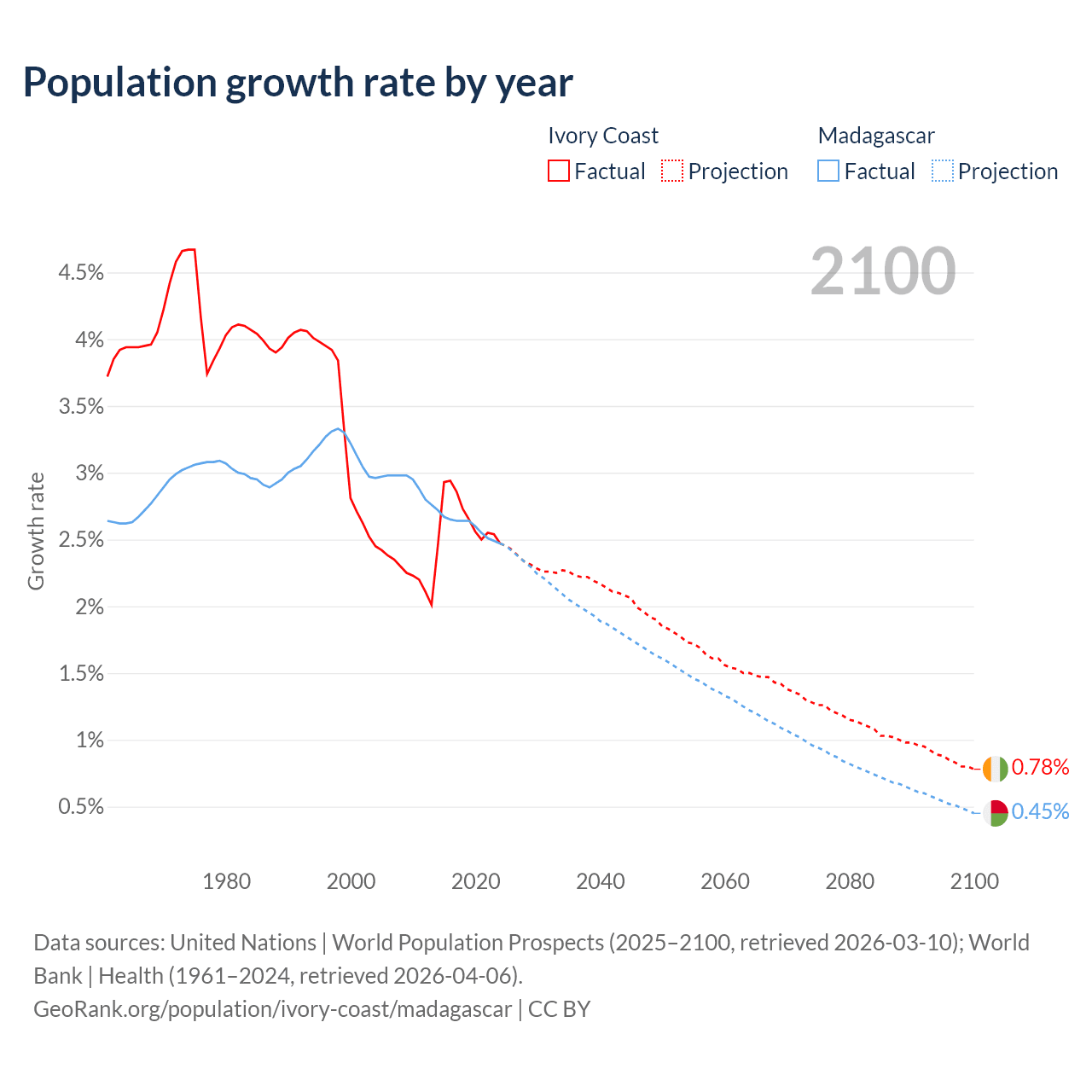 - For the last 10 years, Ivory Coast has had an average growth rate of +2.65% per year vs +2.6% in Madagascar.