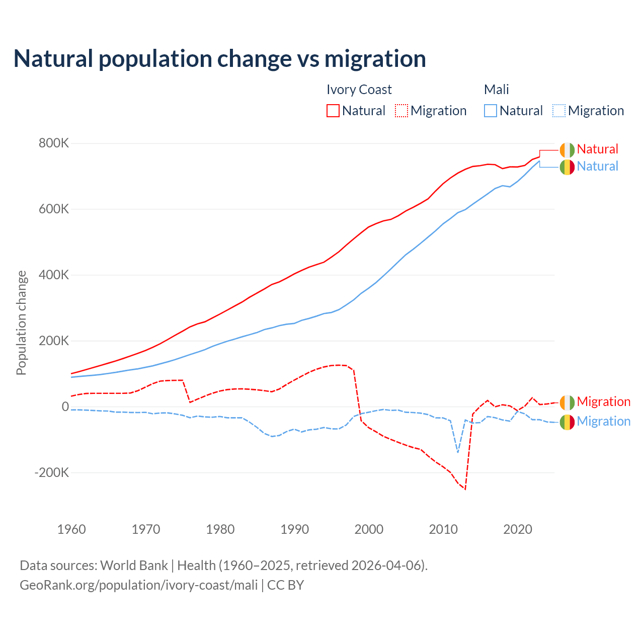 Over the last 10 years, 99.7% of the population change in Ivory Coast is from natural causes (a gain of 7,348,944 people) and 0.33% is from migration (a gain of 24,432 people). In Mali 94.9% is from natural causes (a gain of 6,749,473 people) and 5.13% is from migration (a loss of 365,292 people).