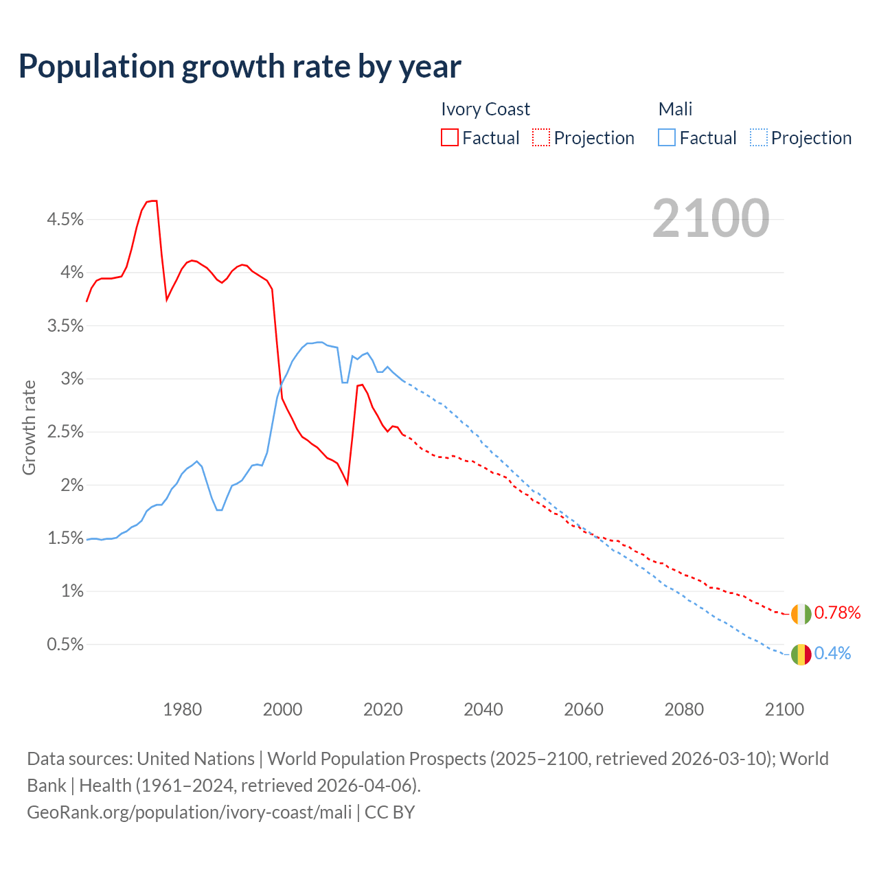 - For the last 10 years, Ivory Coast has had an average growth rate of +2.65% per year vs +3.12% in Mali.