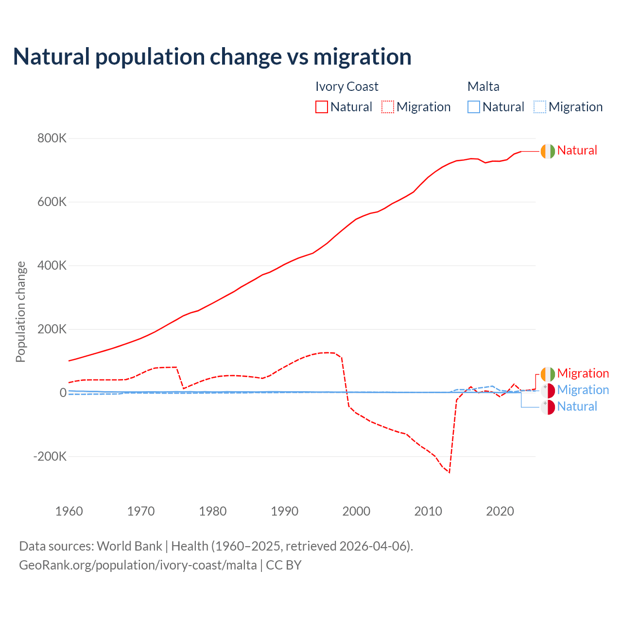 Over the last 10 years, 99.7% of the population change in Ivory Coast is from natural causes (a gain of 7,348,944 people) and 0.33% is from migration (a gain of 24,432 people). In Malta 5.84% is from natural causes (a gain of 6,181 people) and 94.2% is from migration (a gain of 99,652 people).