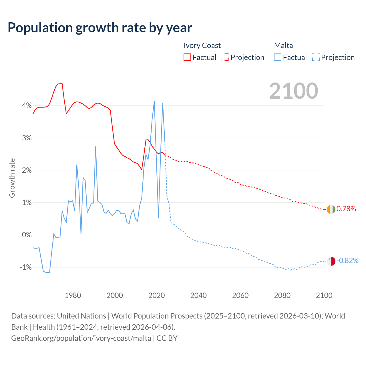 - For the last 10 years, Ivory Coast has had an average growth rate of +2.65% per year vs +2.69% in Malta.