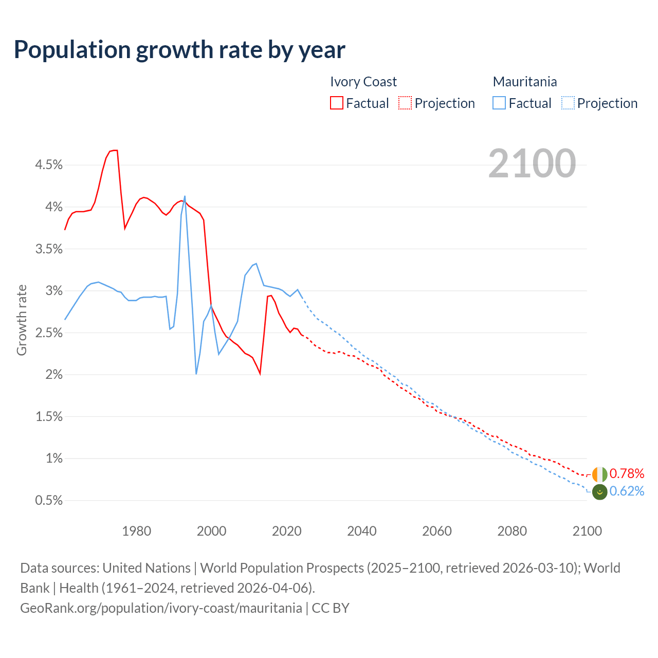 - For the last 10 years, Ivory Coast has had an average growth rate of +2.65% per year vs +3% in Mauritania.