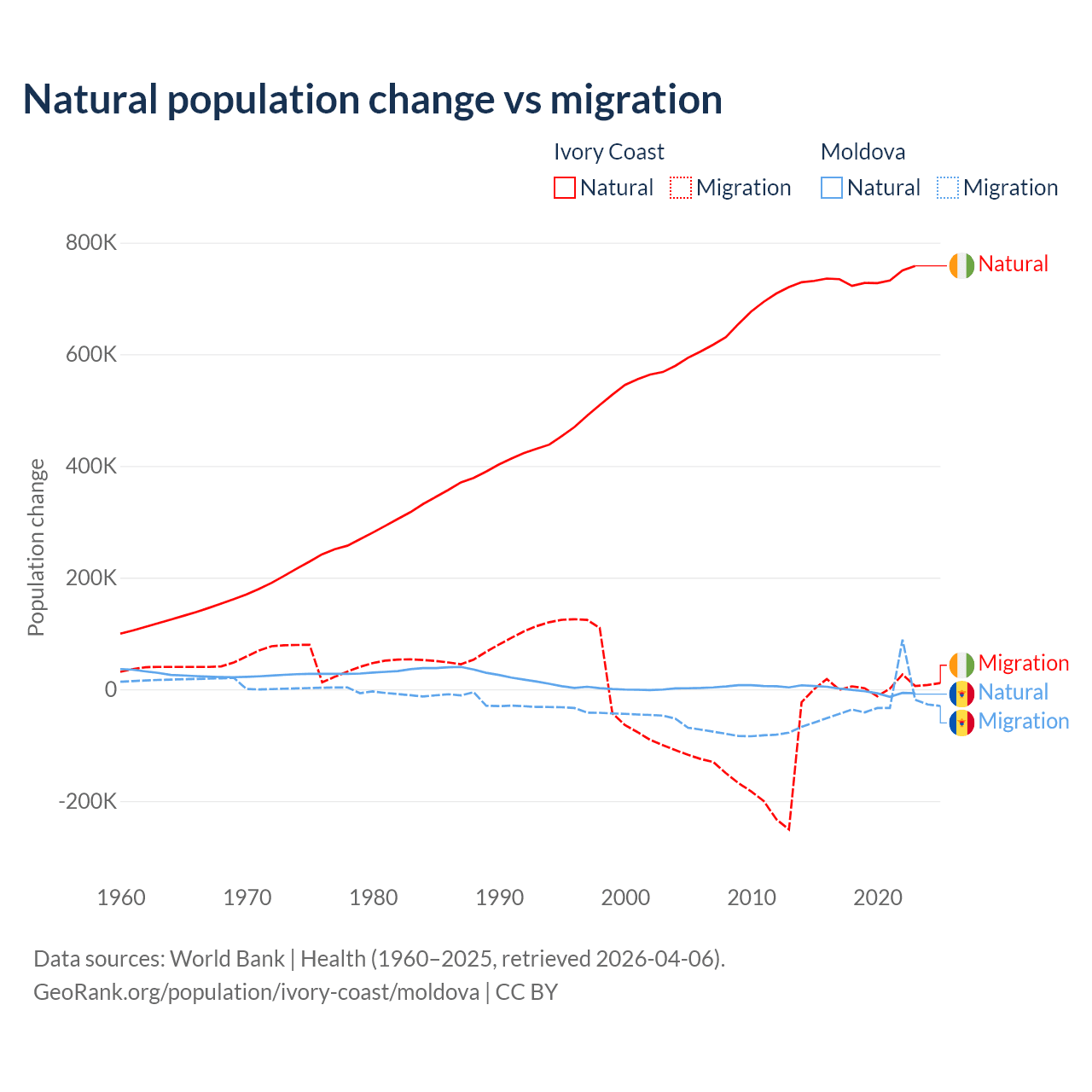 Over the last 10 years, 99.7% of the population change in Ivory Coast is from natural causes (a gain of 7,348,944 people) and 0.33% is from migration (a gain of 24,432 people). In Moldova 6.04% is from natural causes (a loss of 19,001 people) and 94% is from migration (a loss of 295,631 people).