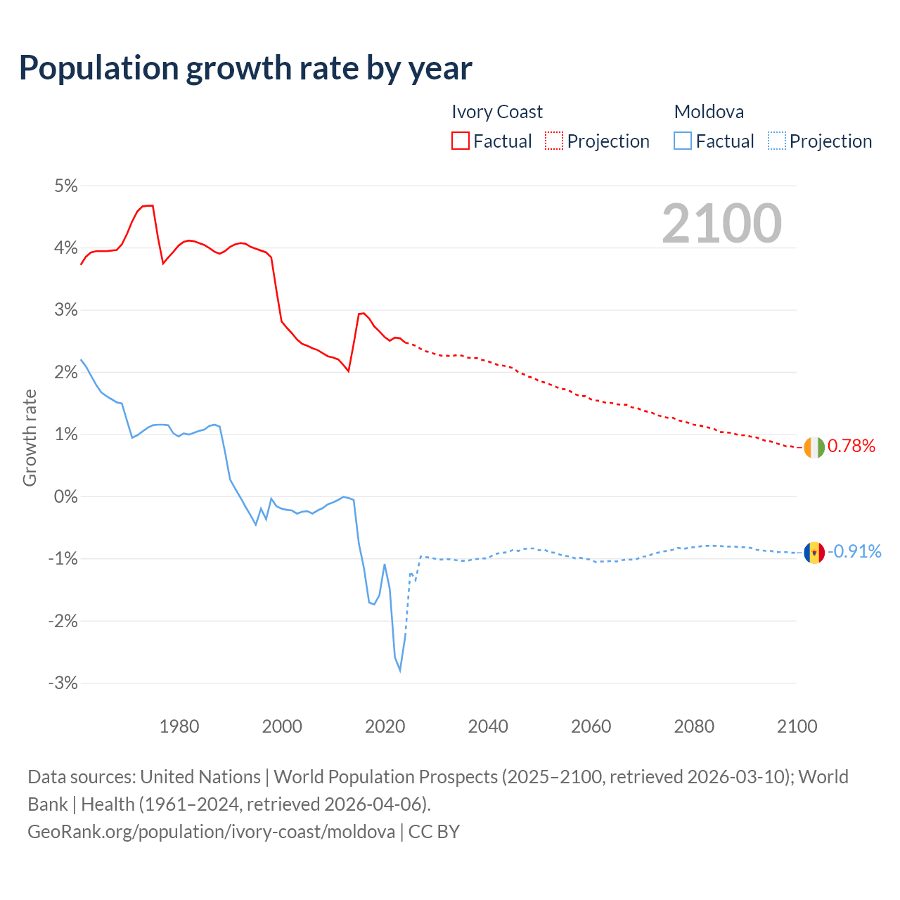 - For the last 10 years, Ivory Coast has had an average growth rate of +2.65% per year vs -1.57% in Moldova.