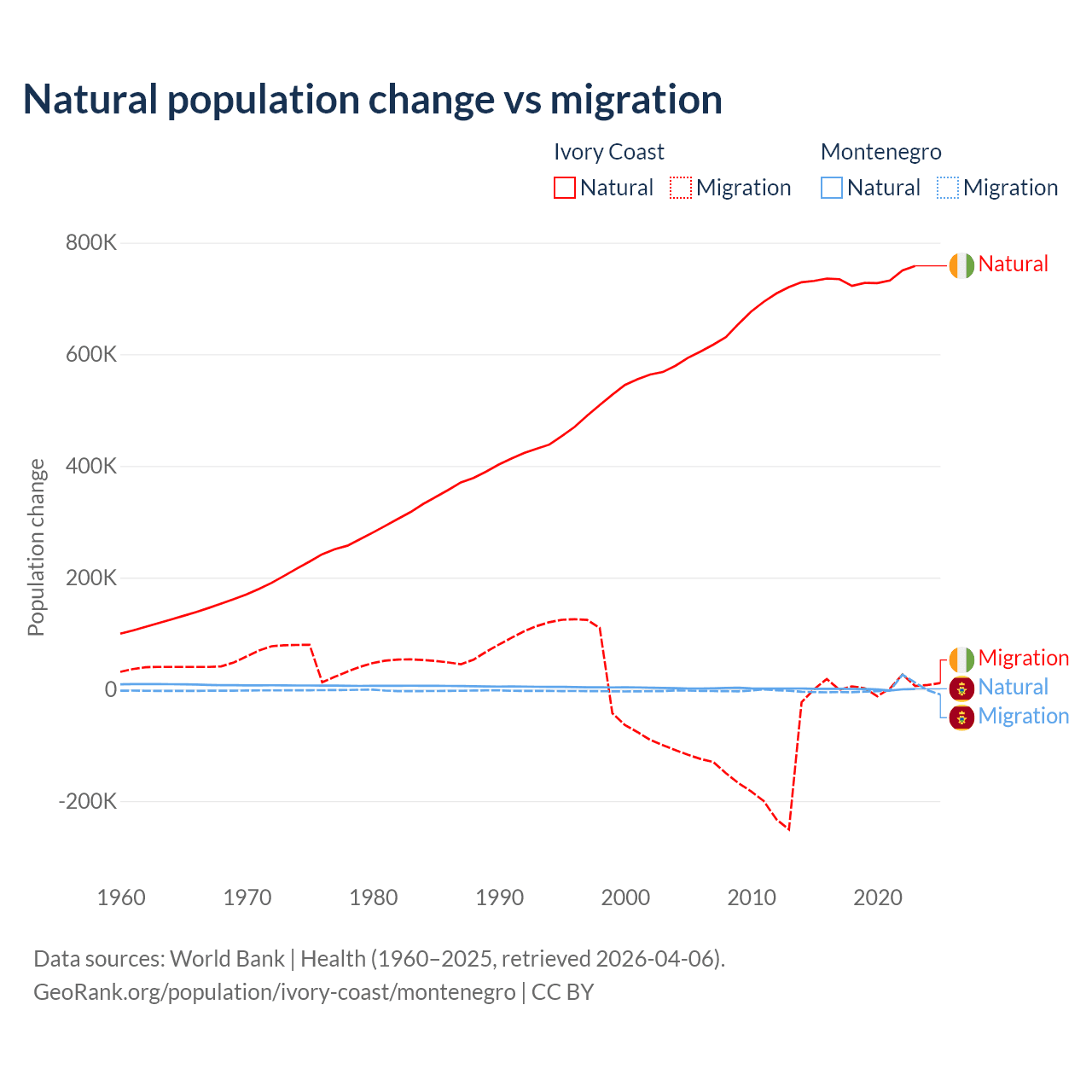 Over the last 10 years, 99.7% of the population change in Ivory Coast is from natural causes (a gain of 7,348,944 people) and 0.33% is from migration (a gain of 24,432 people). In Montenegro 52.4% is from natural causes (a gain of 4,501 people) and 47.6% is from migration (a gain of 4,095 people).