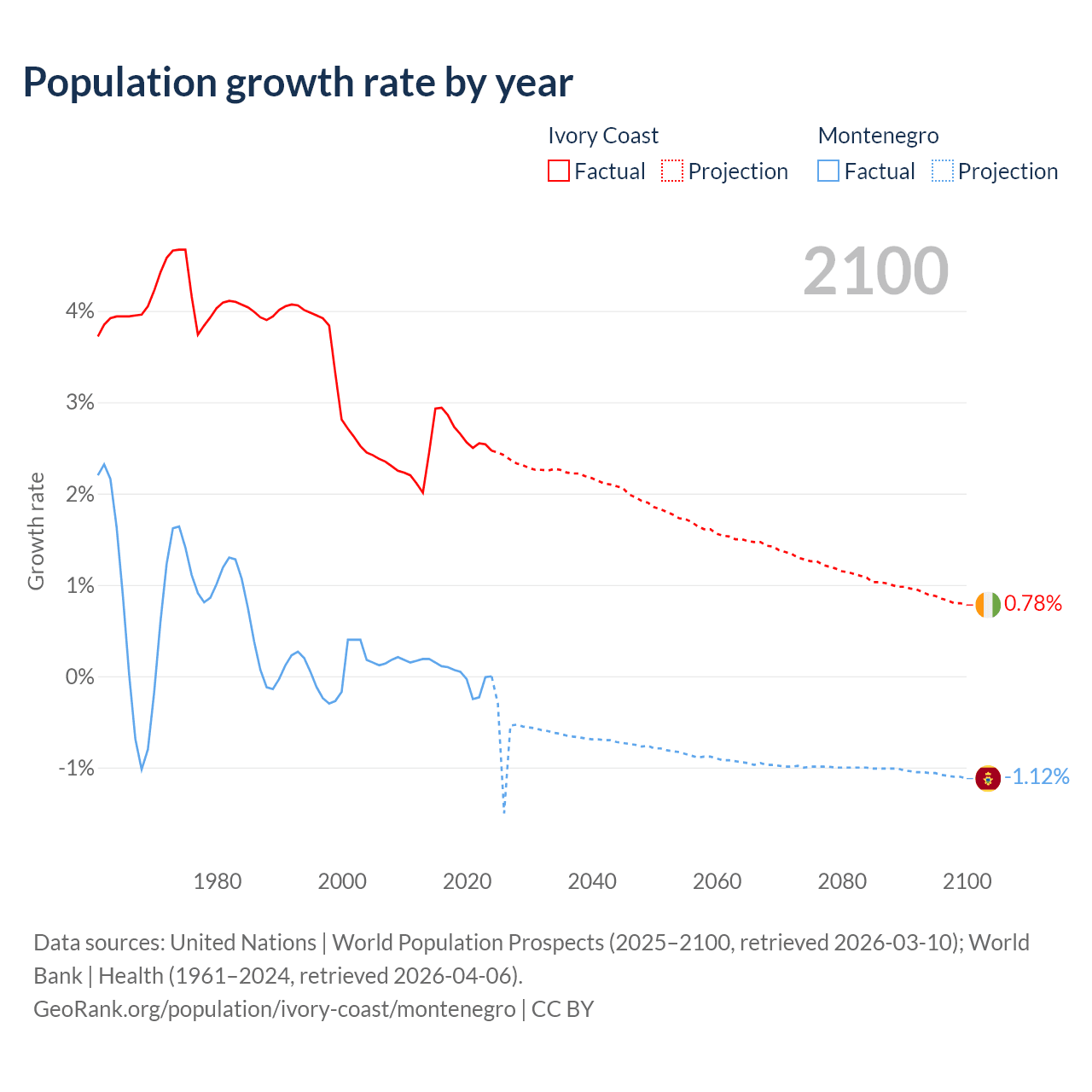 - For the last 10 years, Ivory Coast has had an average growth rate of +2.65% per year vs +0.01% in Montenegro.
