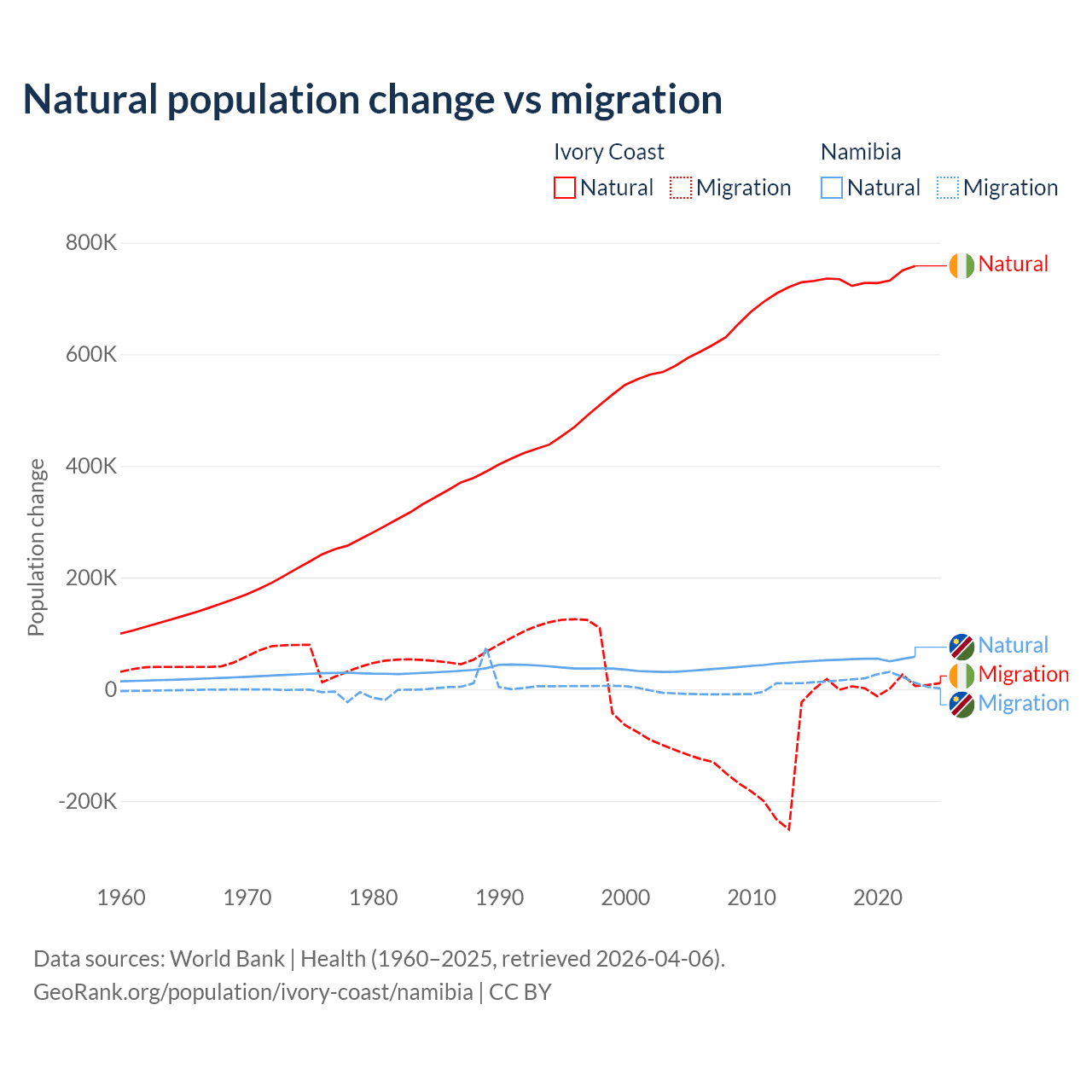 Over the last 10 years, 99.7% of the population change in Ivory Coast is from natural causes (a gain of 7,348,944 people) and 0.33% is from migration (a gain of 24,432 people). In Namibia 74.3% is from natural causes (a gain of 532,532 people) and 25.7% is from migration (a gain of 183,837 people).