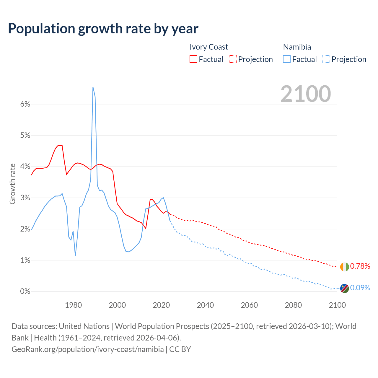 - For the last 10 years, Ivory Coast has had an average growth rate of +2.65% per year vs +2.73% in Namibia.